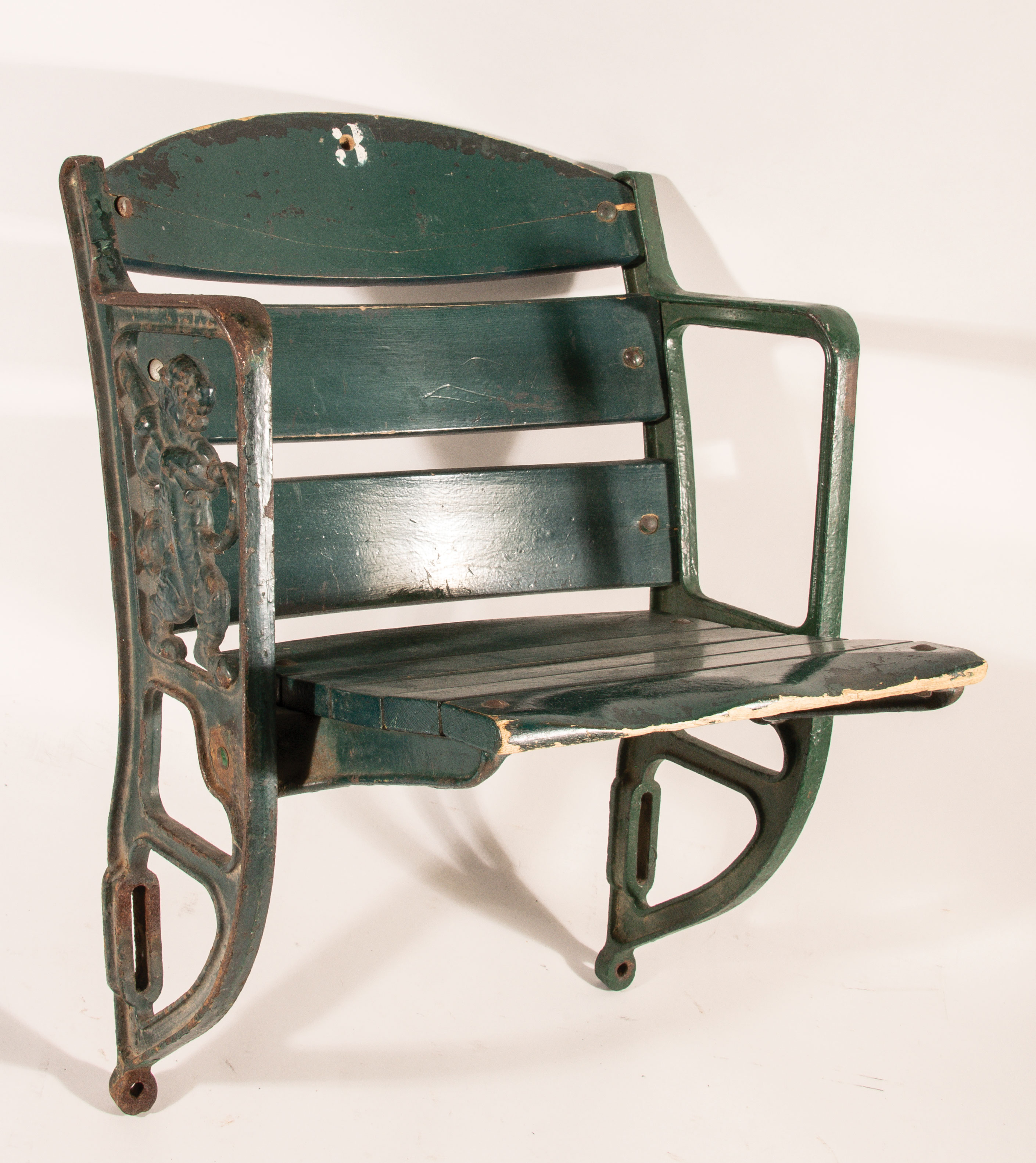 Description:Briggs Stadium (Detroit Tigers) seat with figural end panel. Riser mount seat from the long standing famed venue has a desirable figural end panel showing a Tiger at bat. Casy iron and wood showing wear consistent with long term outdoor use as intended. There is some scattered pitting and chipping to wood (small amount of loss to lower front slat) and a crack or two. Hole is drilled in upper slat: EX