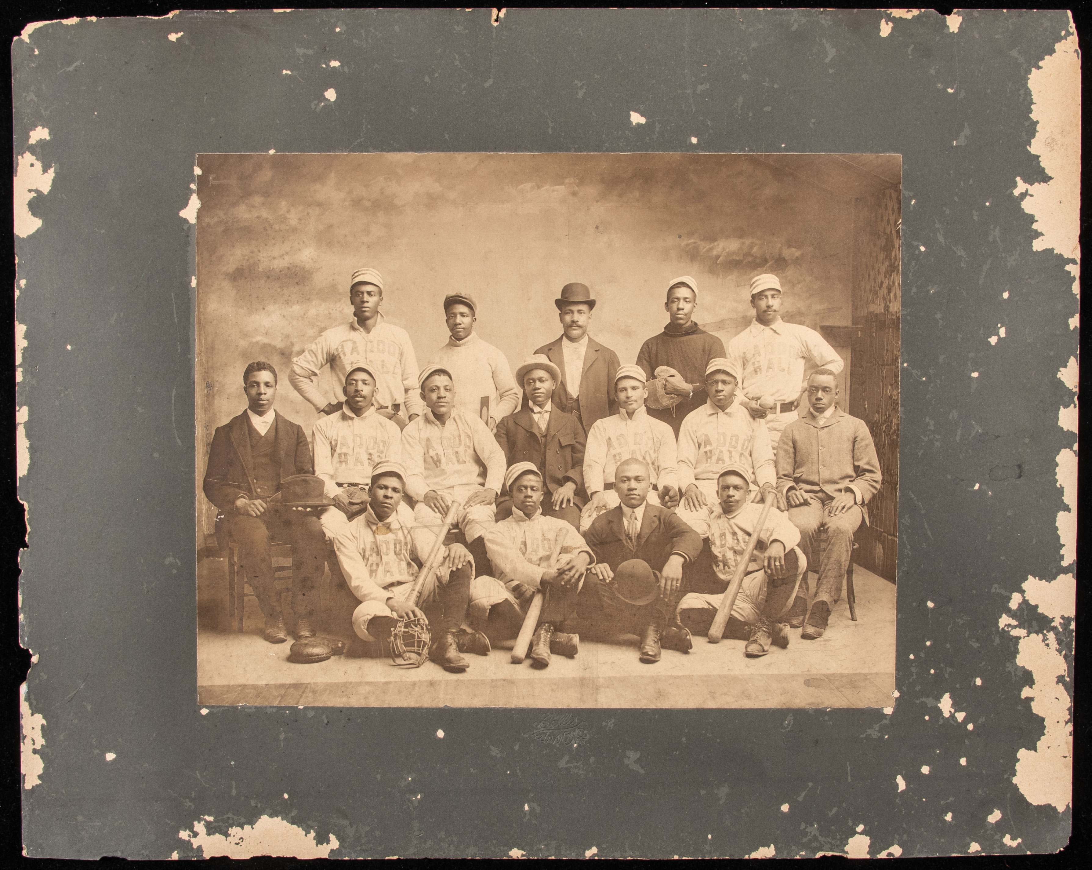 Description:Scarce "Haddon Hall" African American baseball team photograph c.1890s-1900s. Exceedingly rare oversized sepia toned team photograph showing African American players in what were then top of the line uniforms with similar quality equipment. Uniform fronts have "Haddon Hall" lettered on and there is an Atlantic City studio mark impressed in the mount. Haddon Hall was one of the first hotels to open in Atlantic City and the team was presumably either sponsored by or comprised of workers for the establishment. Image measures 10.5"x13" is largely unaffected by the surface wear/chipping which appears throughout the original 16"x20" mount (See online image for full mount view). One of the earliest African American baseball team images of this large size and quality extant: Image EX, Mount GD