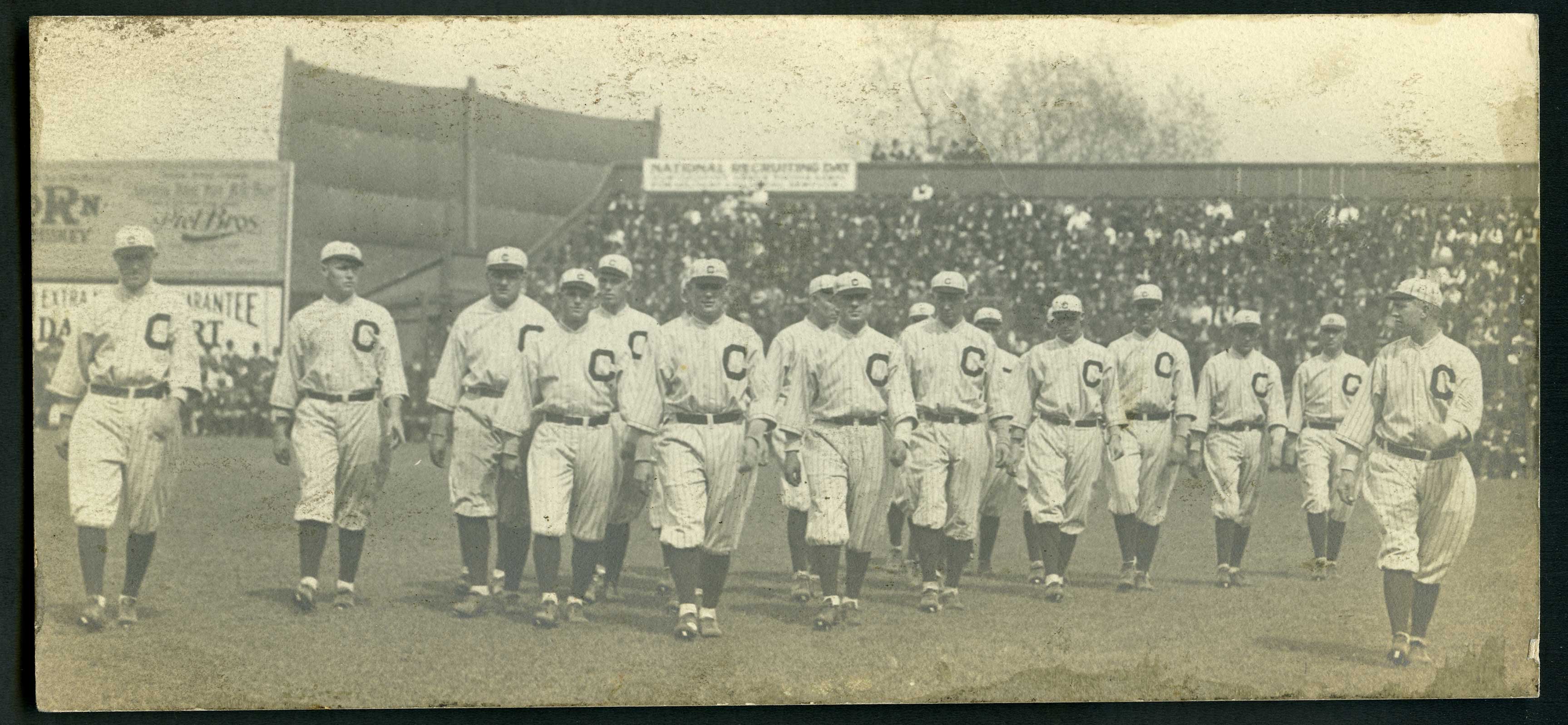 Description:Cleveland Indians Team Photo walking onto field c.1917-1919 featuring Joe Wood. Attractive image measuring approx. 8 1/4" x 3 3/4" with black scrapbook residue on back and "Wood" written in pencil on back. Image has some light general surface wear: VG