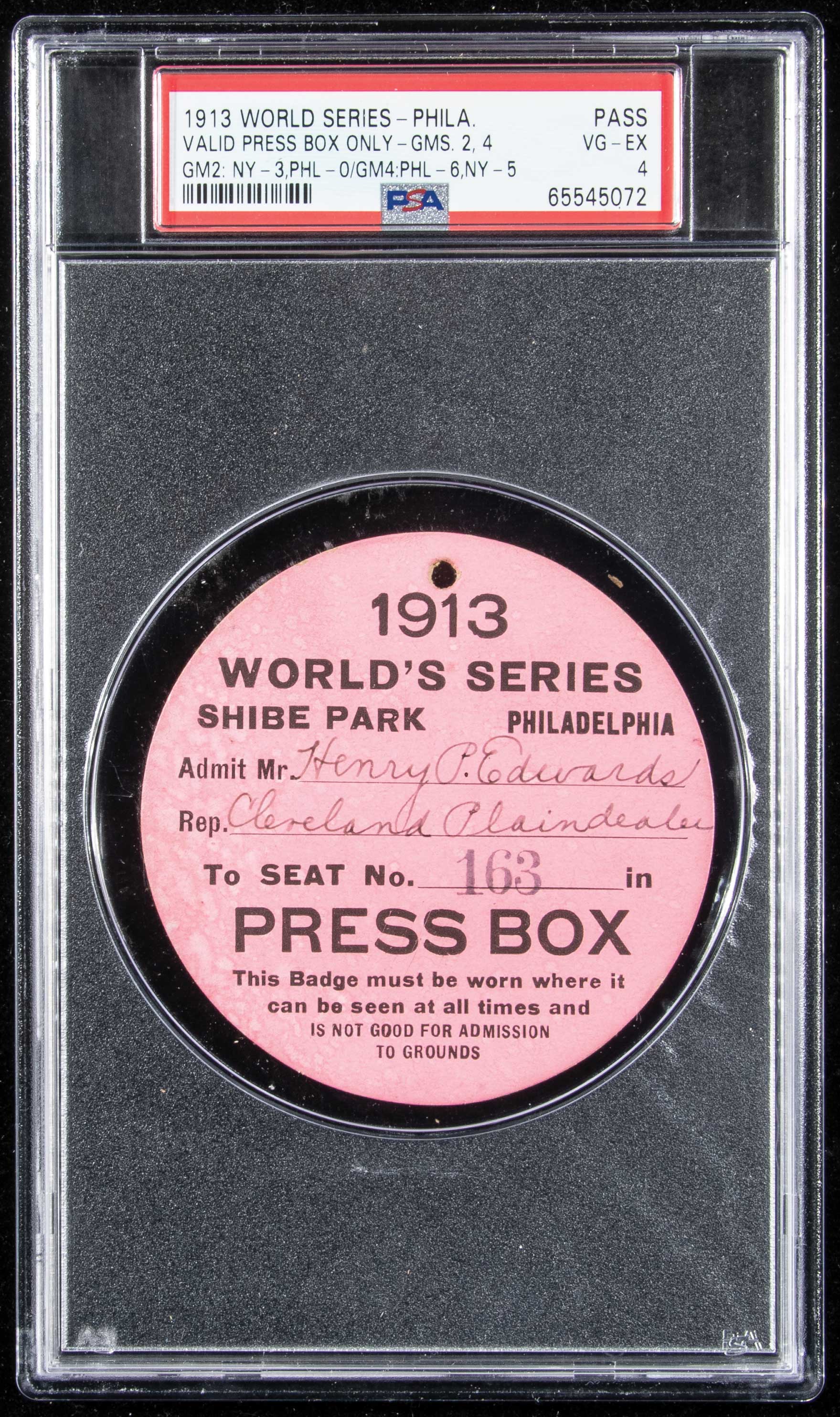 Description:1913 World Series press pass graded PSA 4 VG/EX. Shibe Park badge issued to Henry Edwards of the Cleveland Plain Dealer for access to the press box during 1913 World Series games. The Philadelphia Athletics defeated the New York Giants 4 games to 1. Staining (more visible on the back) accounts for the assigned grade: PSA 4 VG/EX