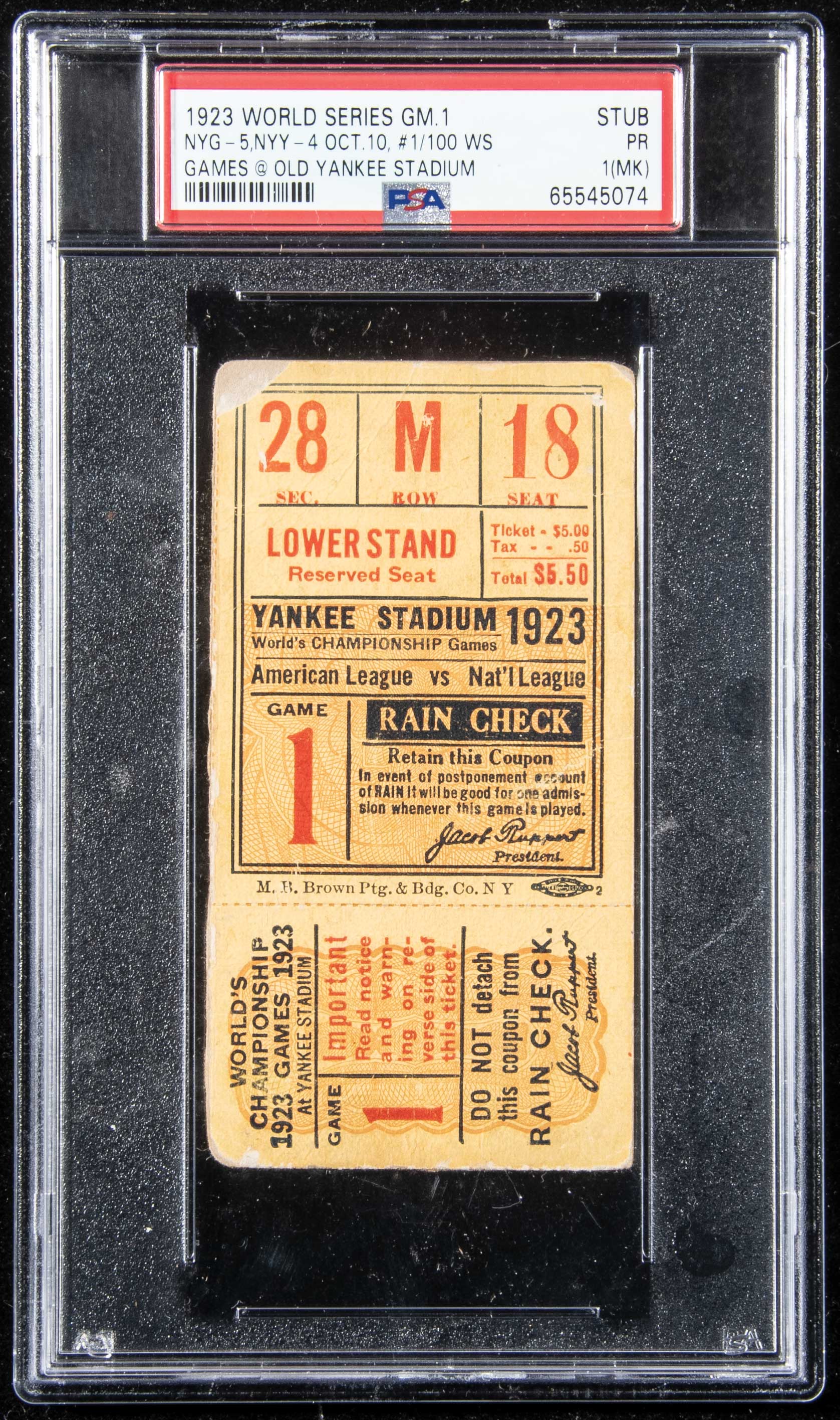 Description:1923 World Series Game 1 ticket stub graded PSA 1 PR (1st World Series game at Yankee Stadium). Yankee Stadium ticket stub from Game 1 in which the New York Giants defeated the New York Yankees by a score of 5-4 behind a 9th inning inside-the-park homer by Casey Stengel. Creasing and paper loss at the corners account for the grade, along with "18" written on the back (noted by the MK qualifier): PSA 1 PR (MK)