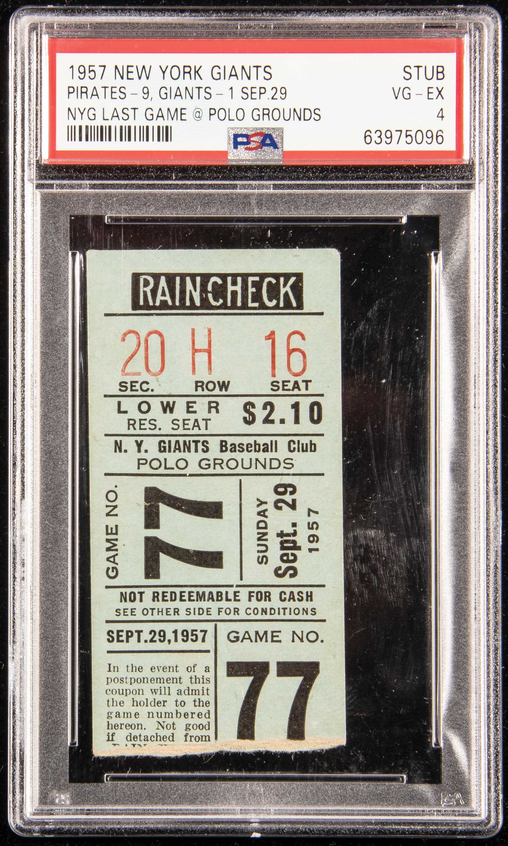 Description:September 29, 1957 New York Giants last game at The Polo Grounds ticket stub (PSA 4 VG-EX)(Highest graded). Desirable original ticket stub issued for the Giants vs. Pirates game played at The Polo Grounds. It would be the last baseball game played at the famed venue before the Giants departed for the West Coast. Clean overall condition with no overt creasing or wrinkles and just a touch of visible corner wear. One of just (12) which have been authenticated by PSA and (1) of (2) graded at this level with none higher: PSA VG-EX 4