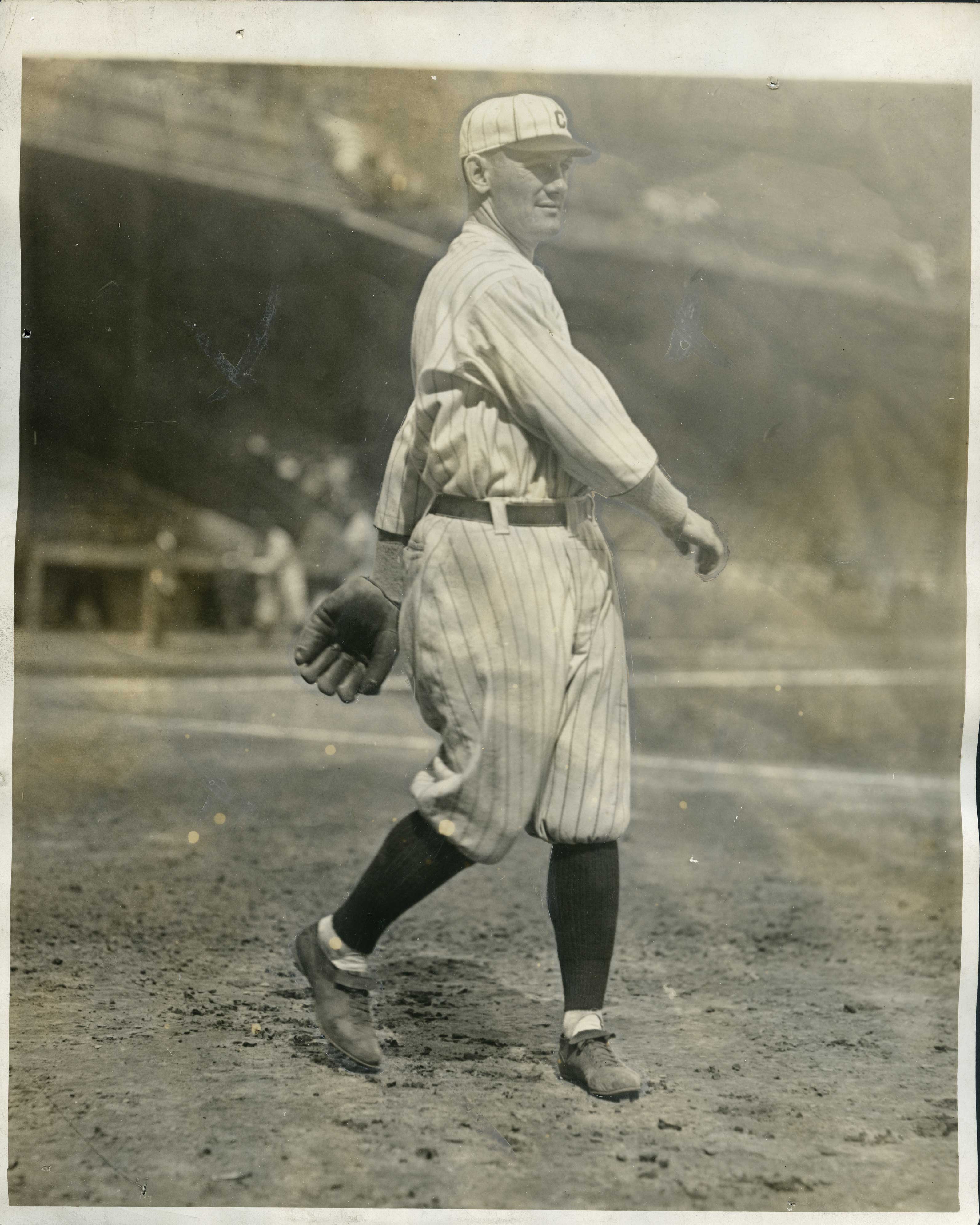 Description:Ray Chapman photograph by Louis Van Oeyen c.1910s. Sepia toned photo having light general wear with a few scattered pin/tack holes and some photographers mask has been removed from the front (vestiges remain visible). "L. Van Oeyen" stamp appears on the back with some other markings and a "Baseball Magazine" hologram. Uncommon original image of the only player to be killed during a Major League Baseball game. Includes LOA from PSA/DNA graded "Type I": GD/VG