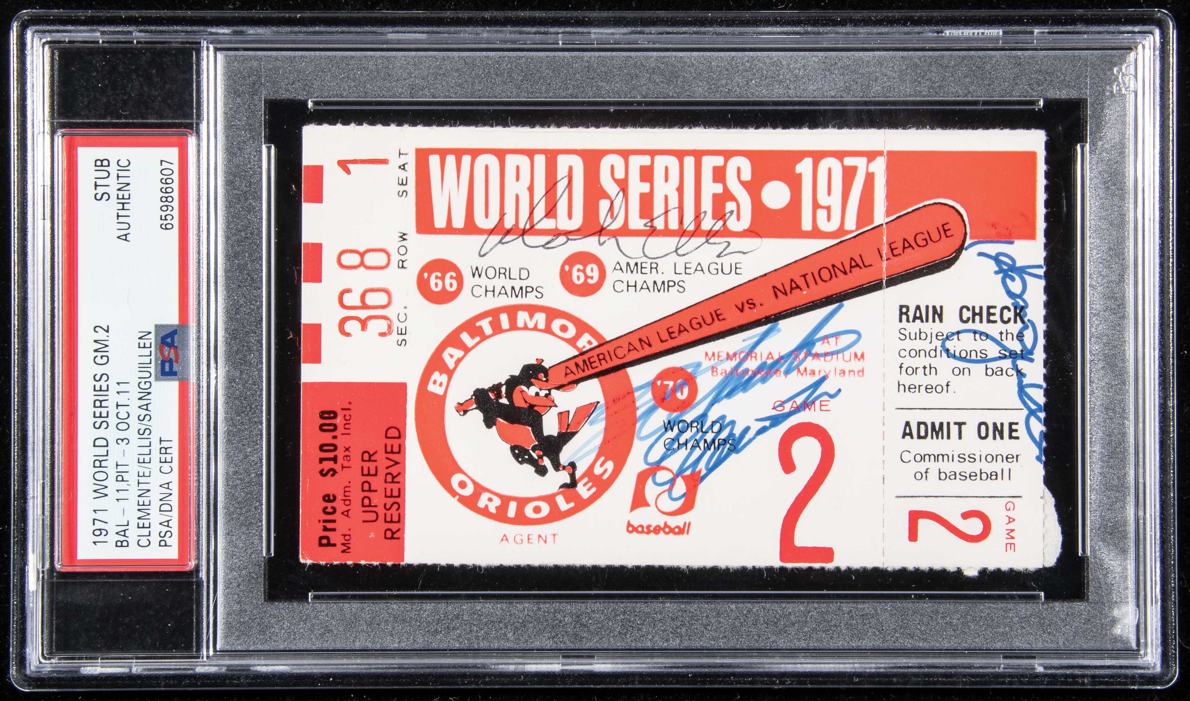 Description:Roberto Clemente, Manny Sanguillen, and Dock Ellis autographed 1971 World Series ticket stub (PSA/DNA). Memorial Stadium ticket stub from Game 2 in which Jim Palmer and the Baltimore Orioles defeated the Pittsburgh Pirates by a score of 11-3 despite two hits from Clemente. The ticket is signed by Clemente, Ellis, and Sanguillen (top of his signature is missing where the other side of the stub was torn off). Clemente's signature remains bold, rating 8 out of 10, with minor fading to the "R". Light crease, which is more visible on the back. Encapsulated as Authentic by PSA/DNA, and also includes full LOA from JSA: VG/EX-EX