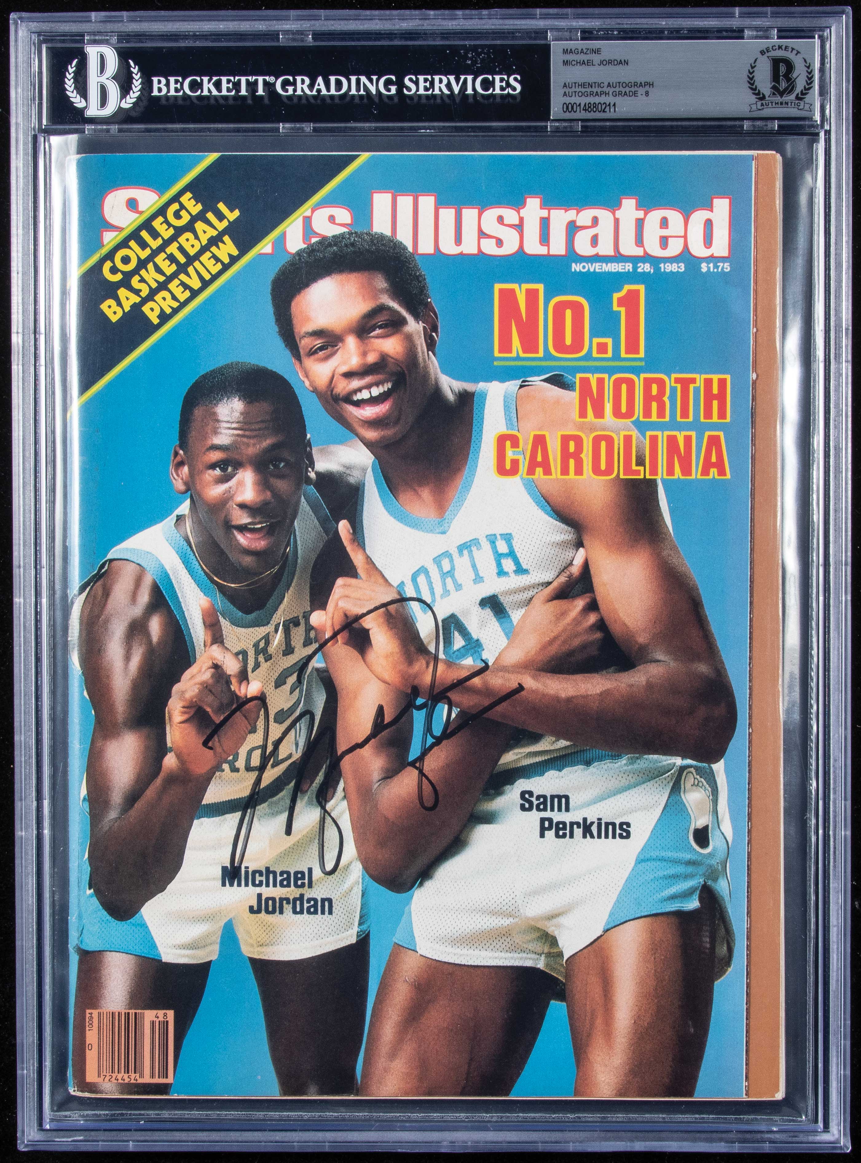 Description:Michael Jordan autographed November 28, 1983 Sports Illustrated - The first of (50) S.I. cover appearances (Beckett "8" auto grade). Vintage Sports Illustrated showing Jordan as a member of the North Carolina Tar Heels is the first of a record (50) covers of the seminal magazine on which he appeared. Signed "Michael Jordan" in black marker and authenticated/encapsulated by Beckett with the signature graded "8." Magazine itself shows some light corner and edge wear with a minor chip along one back edge. Includes letter of provenance from Howard Kaplan: Auto graded BAS "8", Magazine EX