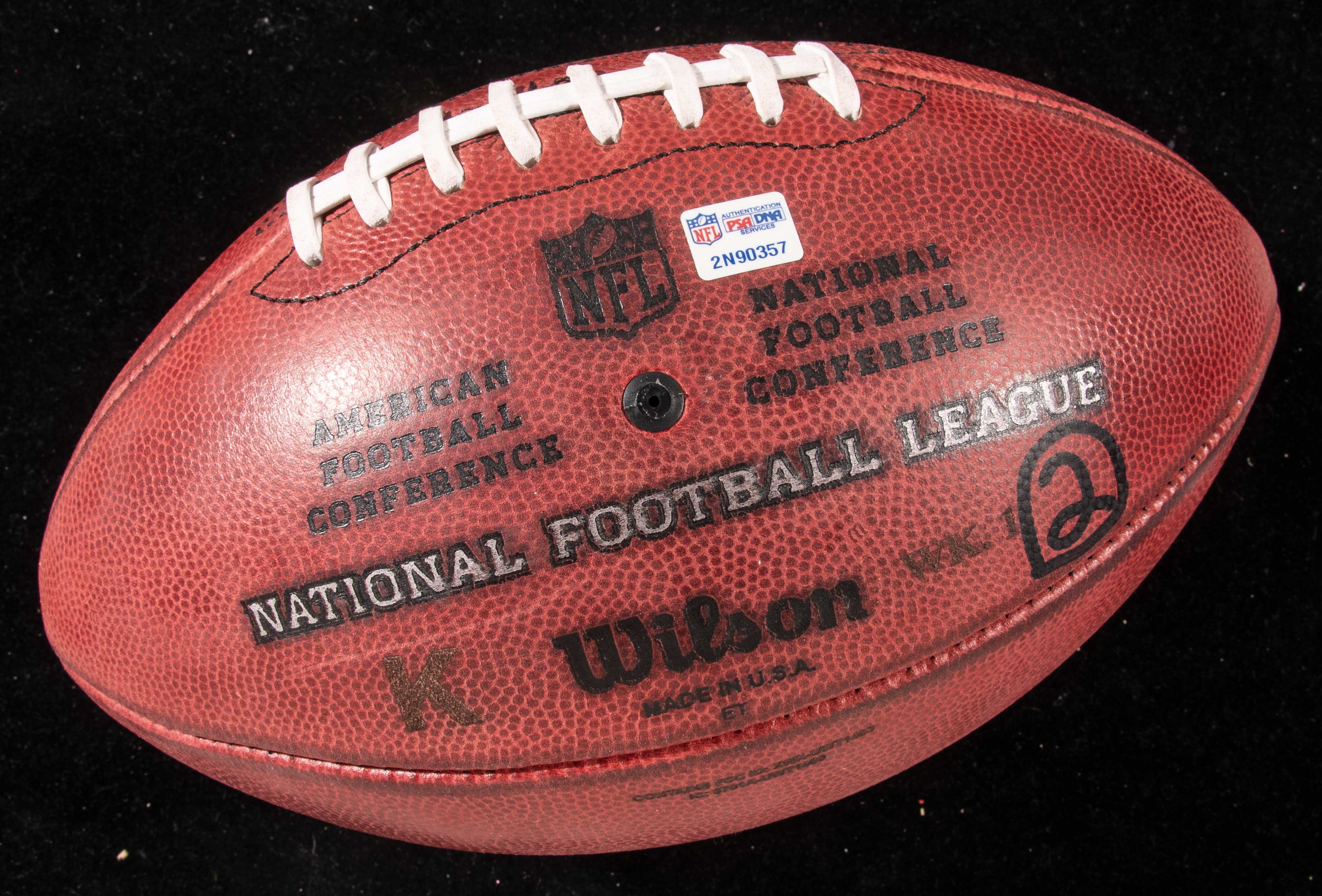 Description:9/8/2022 Buffalo Bills at Los Angeles Rams season opener game used kickoff football. Wilson "The Duke" NFL football kicked by Tyler Bass to open the 2nd half and returned by Brandon Powell for 12-yards. "K" and WK.1" are branded on the ball, and "2" is written in black marker. Includes NFL Auction COA from PSA/DNA, with matching serial #2N90357 sticker on the ball: EX/MT