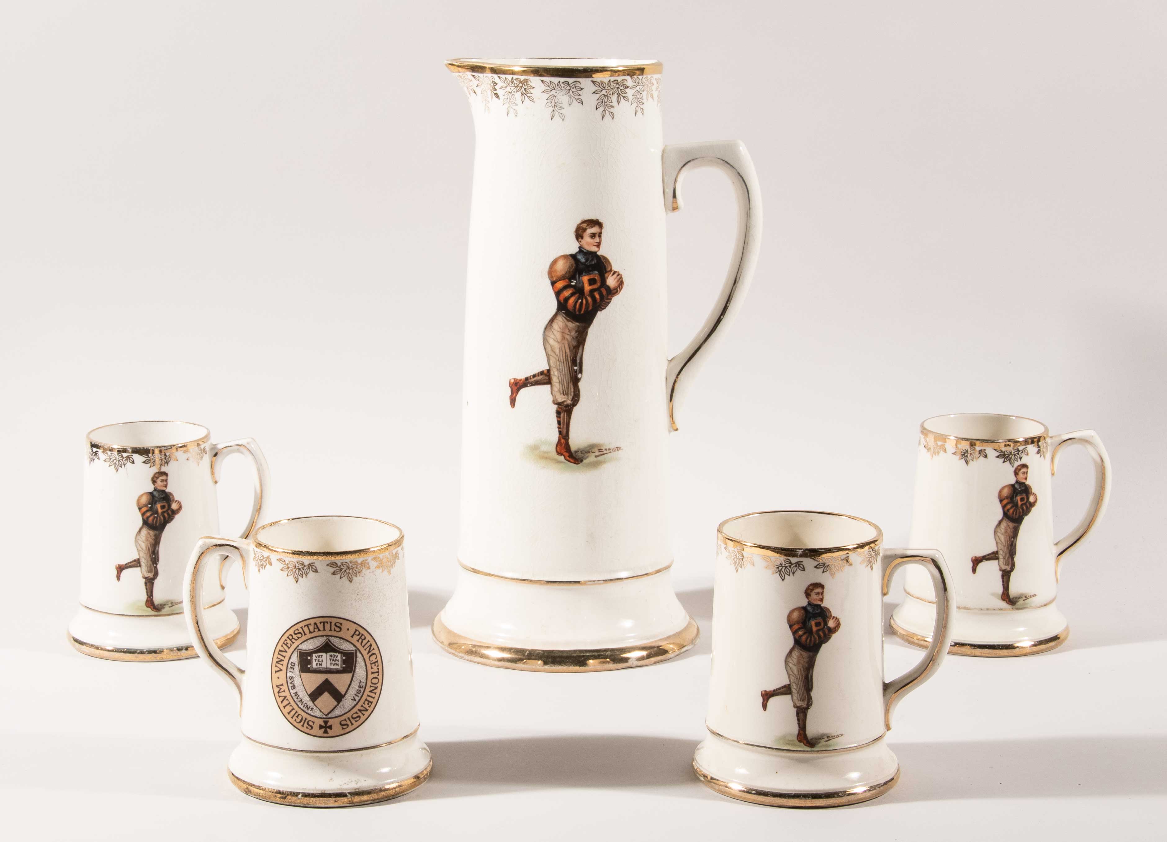 Description:Princeton University football decorated porcelain water set c.1905-10. Large 14" tall handled porcelain water pitcher with hand painted Princeton University football player on front signed by noted artist F.Earl Christy and school insignia on back. Includes four matching 5" tall handled mugs one of which having interior hairline crack: Range EX--NM