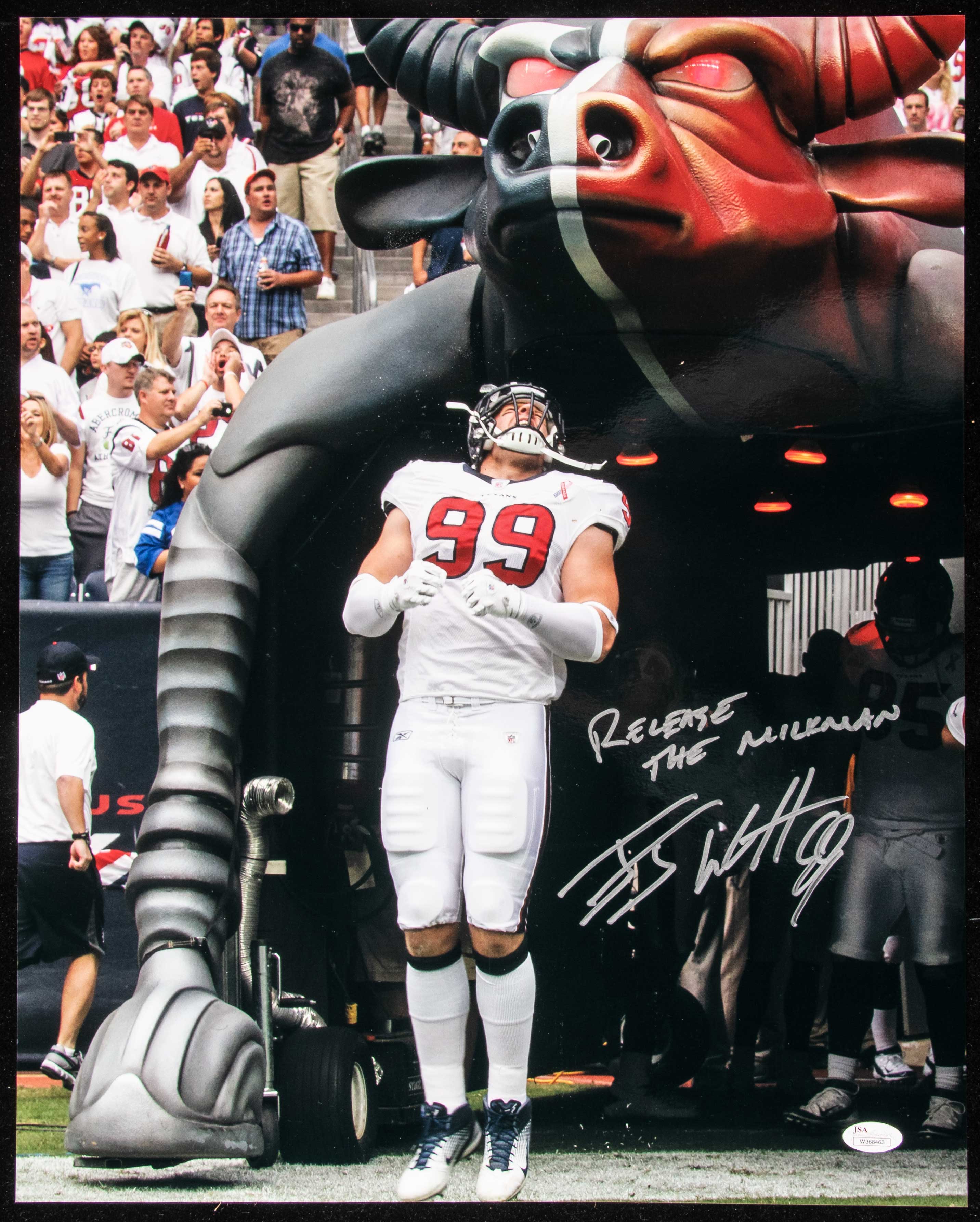 Description:Highly significant J.J. Watt autographed game worn 9/11/2011 jersey from his first career game (NFL Auction)(Photo Match). Reebok NFL Equipment #99 Texans jersey worn by Watt during their season opener against the Colts, which coincided with the 10-year anniversary of the 9/11 attacks, and is memorialized with a patch on the chest. “04-48 O” strip tag is sewn inside the collar, and the tail has been customized with elastic. Watt signed the jersey in black marker. Signature rates 8/9 out of 10. The future first-ballot Hall Of Famer began his career with a typical J.J. Watt game recording 5-tackles, a fumble recovery, and a QB hit. The jersey shows extensive use with numerous stains and impact marks mainly around the front and back of the shoulders. Includes an autographed 16”x20” photo with “Release The Milkman” inscription which pictures Watt coming out of the tunnel prior to this first game of his career (JSA), along with an autographed 8”x10” photo which pictures Watt during the game (PSA/DNA). Also includes NFL Auction COA from PSA/DNA (matching serial #N77282 sticker on the jersey). Photos NM, Jersey EX