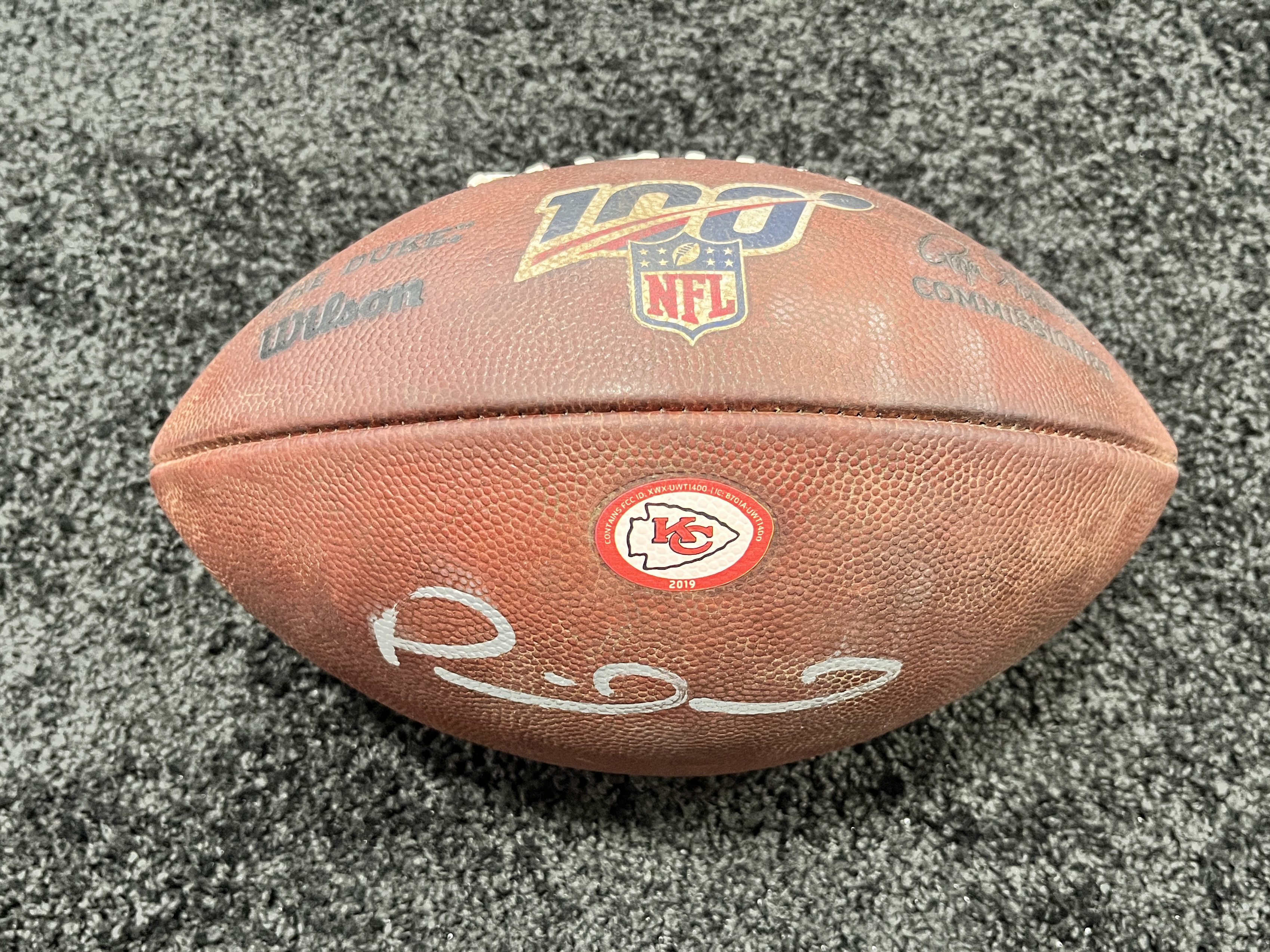 Description:Patrick Mahomes autographed 2019 Kansas City Chiefs game used football. Wilson "The Duke" R.Goodell Official NFL football has an imprinted "NFL 100" red, white, and blue logo as used League wide during the 2019 season. Just below is a heat applied "KC" Chiefs logo with the year "2019" noted confirming that is was prepared for their use in a game. It has been signed "Patrick Mahomes" on the side panel in silver marker rating 8 out of 10. Ball shows nice use. Beckett Authentication hologram affixed related to the signature. Includes LOA from Hunt Auctions: EX