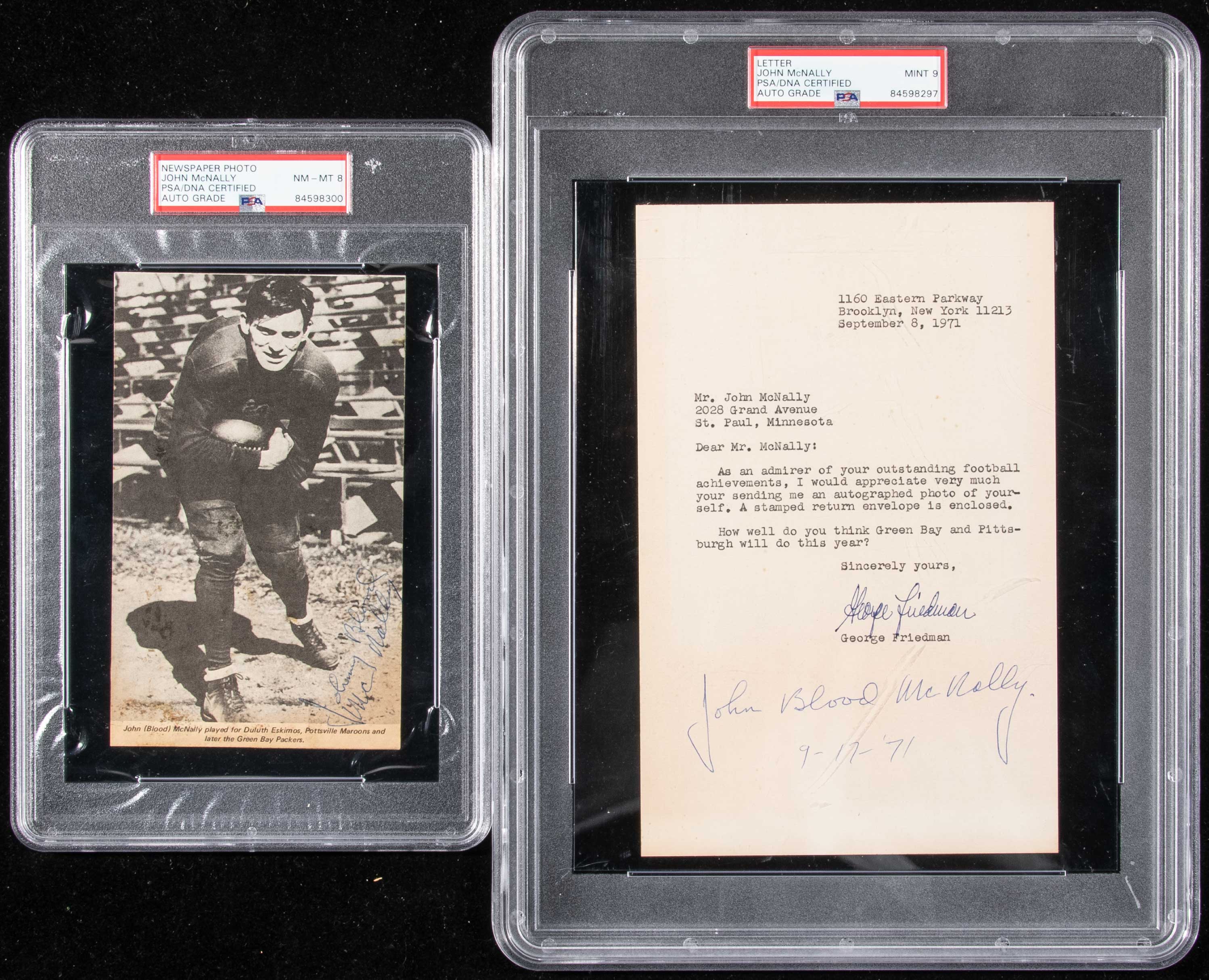 Description:John Blood McNally autographed publication photo and related letter. Includes September 8, 1971 dated letter which asks McNally for a signed photograph. He has signed it "John Blood McNally 9-17-71" along the bottom edge; approx. 4"x6.5" image which was removed from a publication that has likewise been signed "Johnny Blood McNally." Both pieces are authenticated and encapsulated by PSA with the signatures graded "NM-MT 8" (image) and "Mint 9" (letter). Light to mild toning and there is mounted residue/discoloration throughout the back of the image: Sigs. NM-MT, Pieces VG-EX
