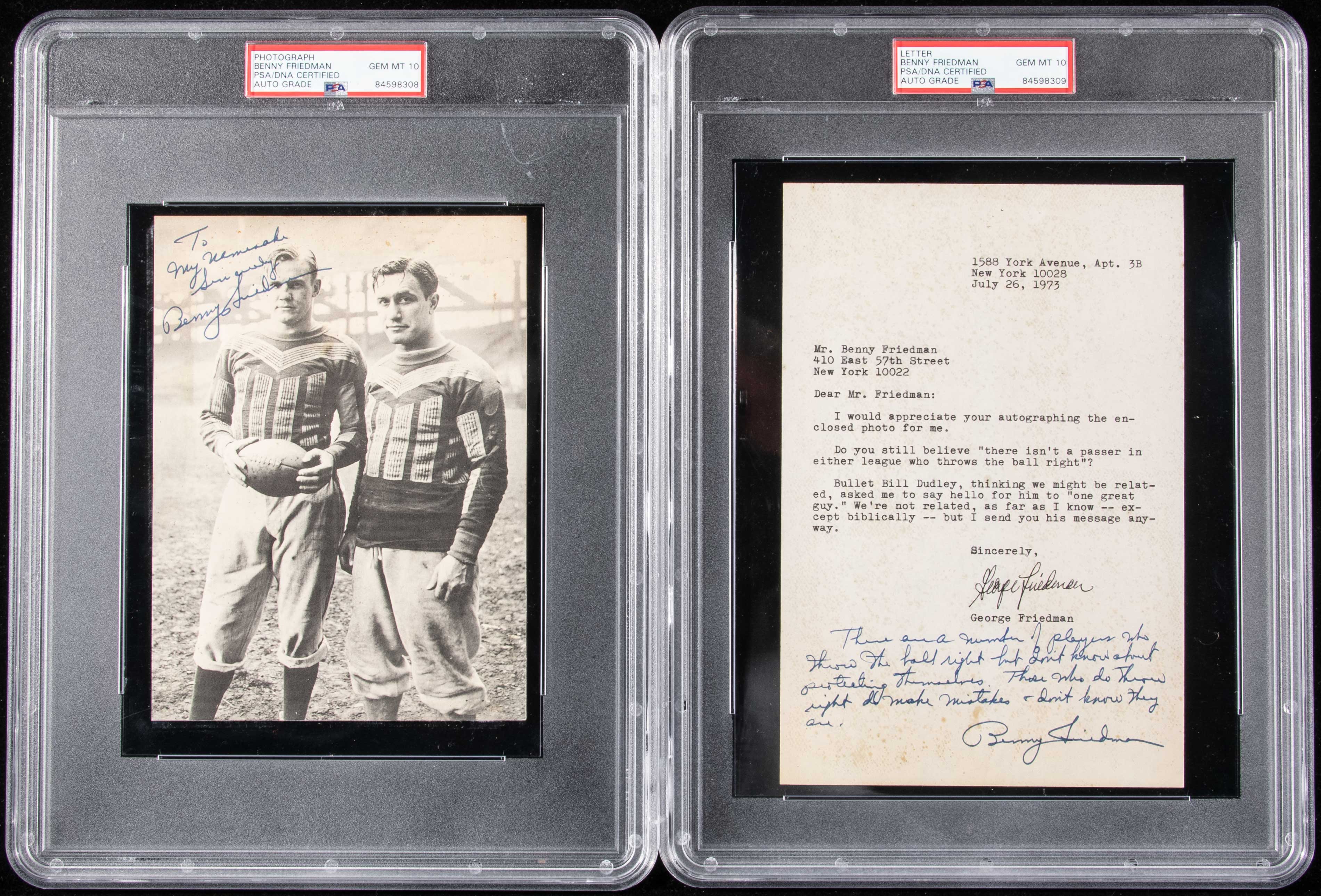 Description:Benny Friedman autographed publication photo and related letter (PSA 10 GEM MINT). Includes July 26, 1973 dated letter which asks Friedman to sign an image and asks a question about passers. Friedman has signed it "Benney Friedman" below his handwritten response to the question and there is some great football related content; approx. 5.5"x7.5" image which was removed from a publication that has likewise been signed "Benny Friedman" with "To My Namesake" written above (sender of the letter was of the same last name). Both pieces are authenticated and encapsulated by PSA with the signatures graded "Gem Mint 10." Each has some light age related wear/toning: Sigs. Gem Mint 10, Pieces VG