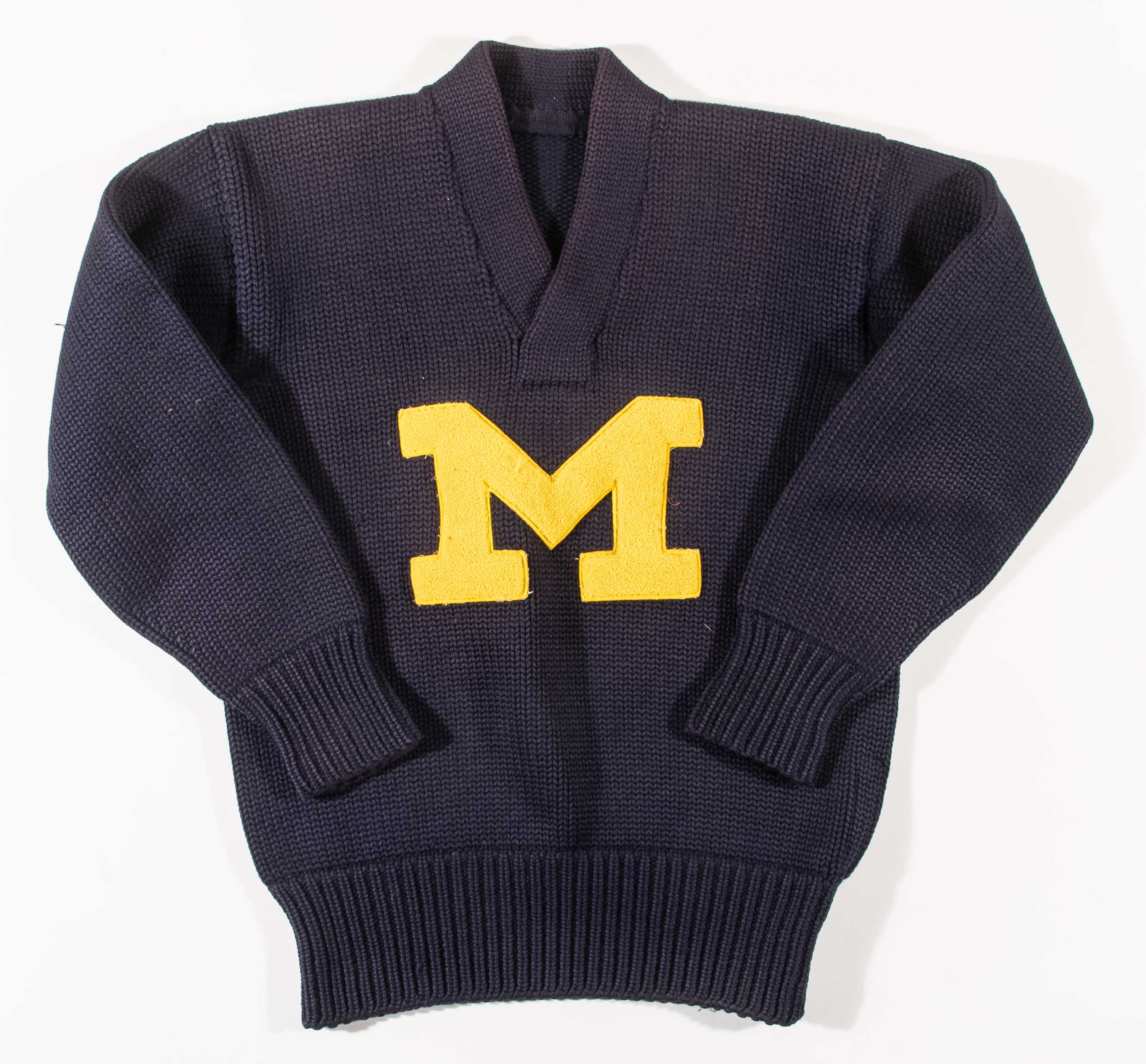 Description:Vintage University of Michigan attributed letterman's' sweater. Heavy wool sweater done in deep blue has a large yellow "M" patch affixed to the front. Unmarked aside from a tag on the inside which is embroidered "F. Klintworth." Outstanding display value with only minor use and age related wear: EX