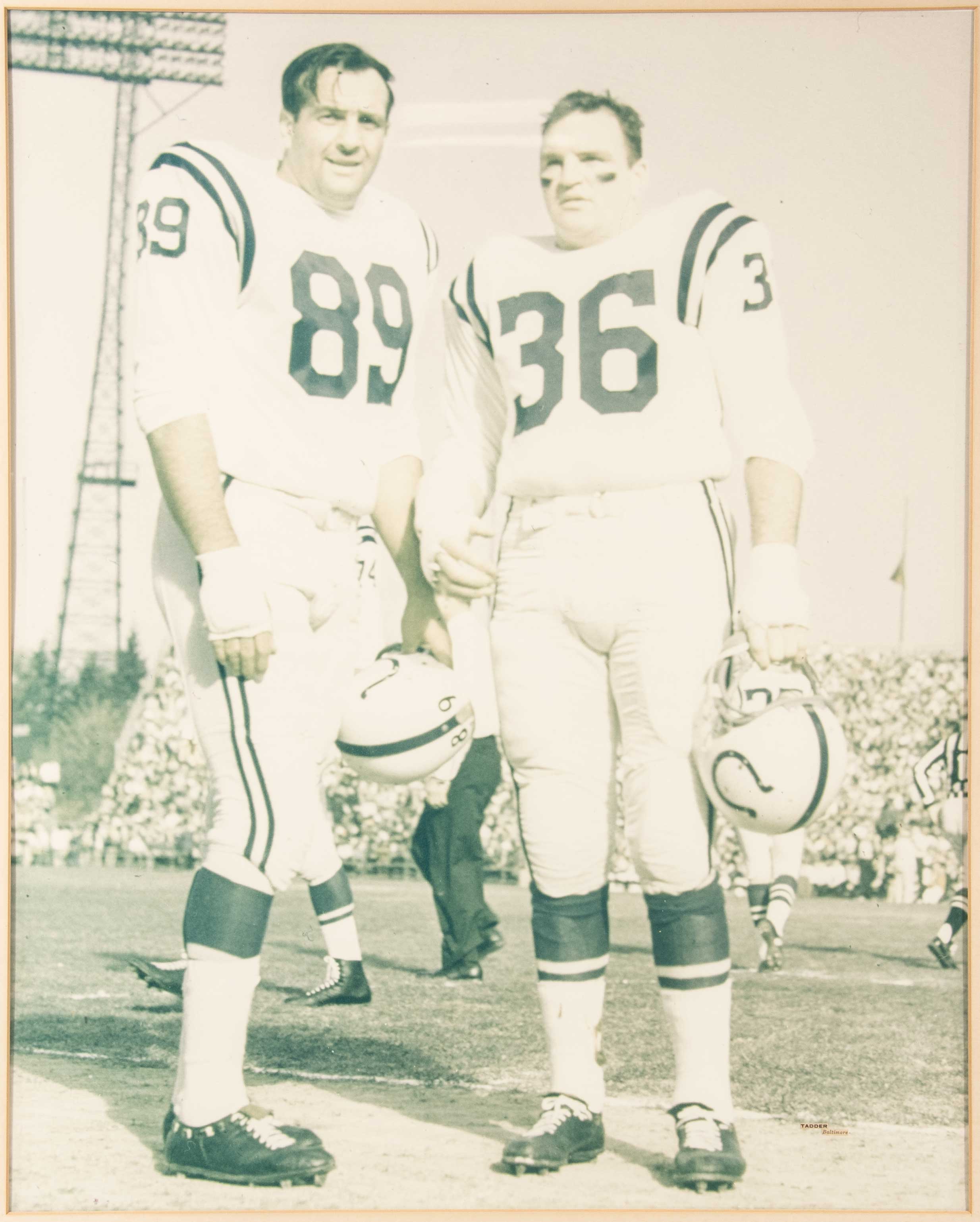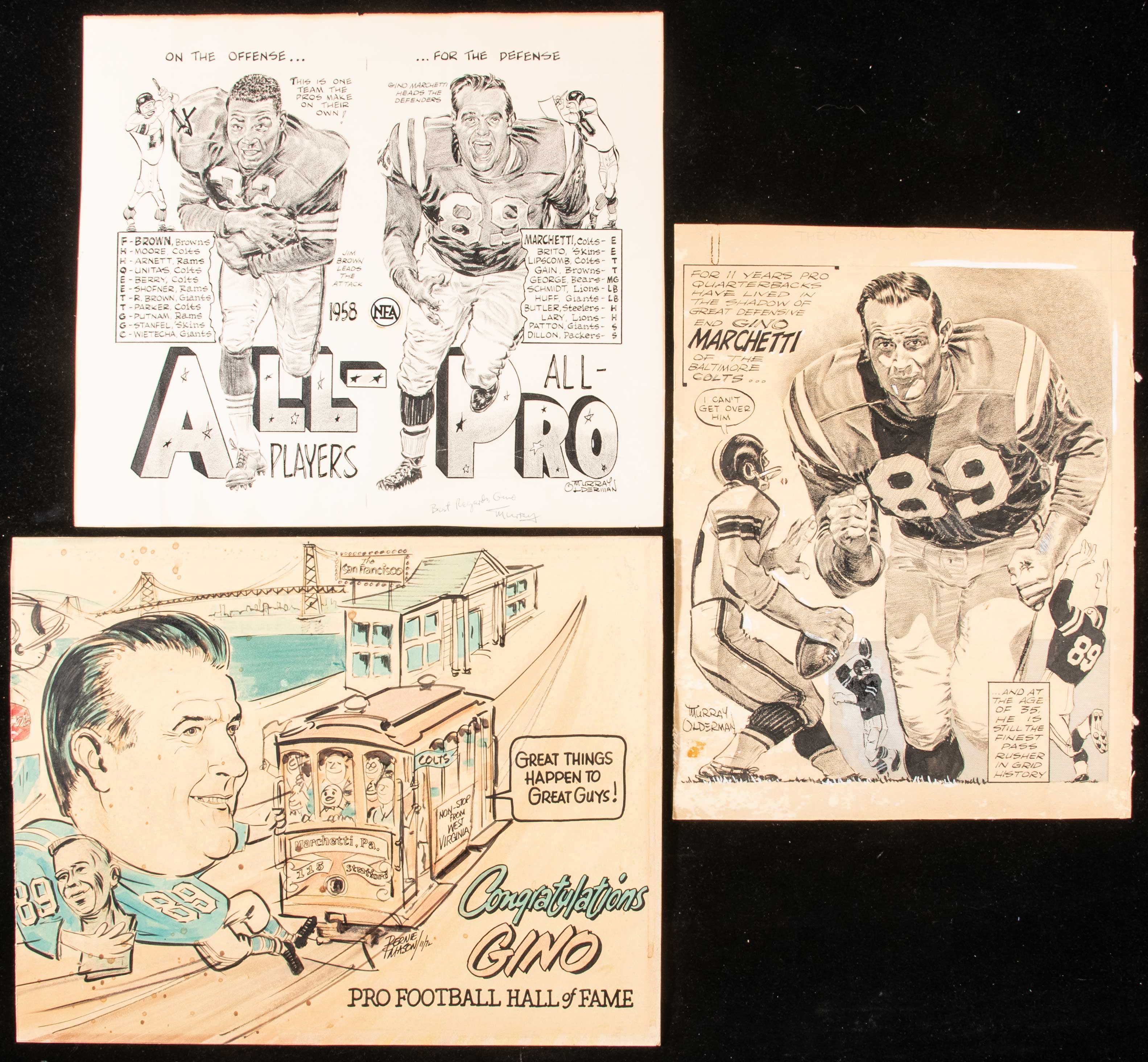 Description:Lot of (4) Gino Marchetti display pieces. Includes large 19"x23" matted and framed image of Marchetti standing in Colts uniform with teammate; Original cartoon artwork of Marchetti by Murray Olderman (11"x14"); Original cartoon artwork of Jim Brown and Marchetti by Murray Olderman signed to Gino from the artist (12"x14"); and original cartoon artwork of Marchetti by Bernie Mason commemorating his HOF induction (12"x15"). Includes letter of provenance from Joan Marchetti: Range EX-NM