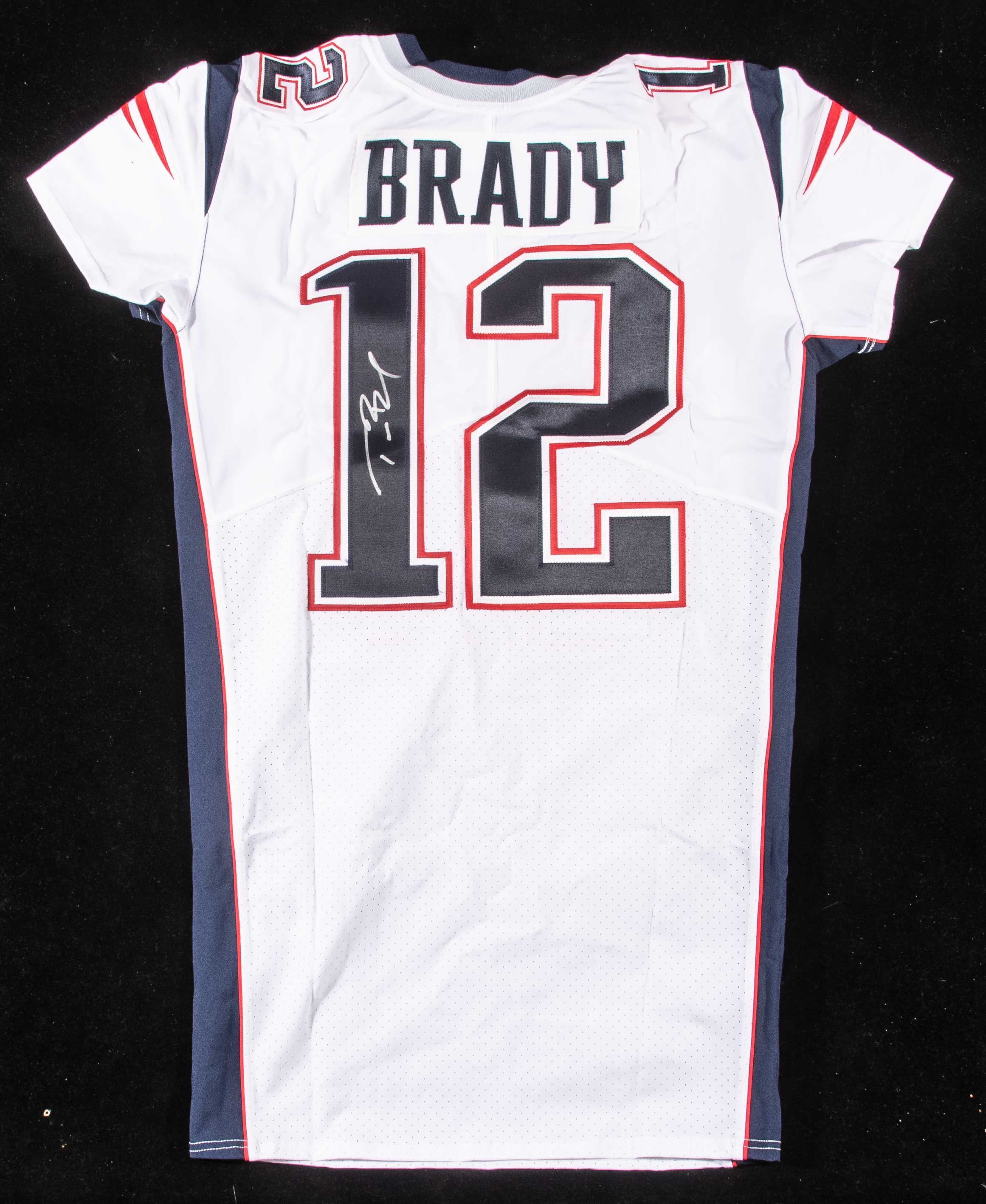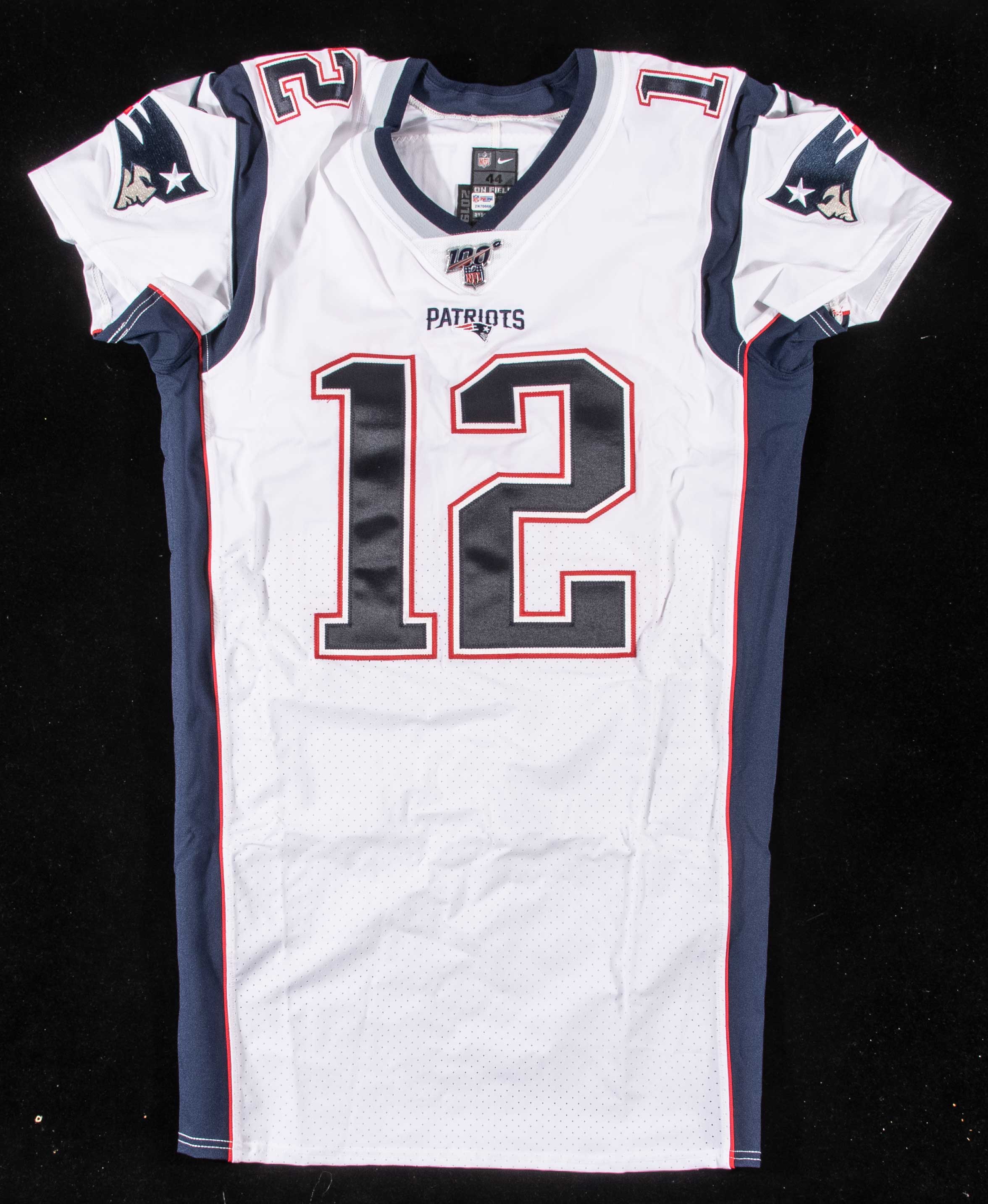 Description:Tom Brady autographed 2019 New England Patriots professional model jersey (final season with team). Nike "On Field" size 44 Patriots #12 Tom Brady jersey with appropriate 2019 professional tagging and NFL 100 patch. Brady signed the jersey in silver marker. Signature rates 8/9 out of 10. Appears unused, with no visible wear. Includes NFL Auction COA from PSA/DNA, with matching serial #ed sticker on the jersey: NM