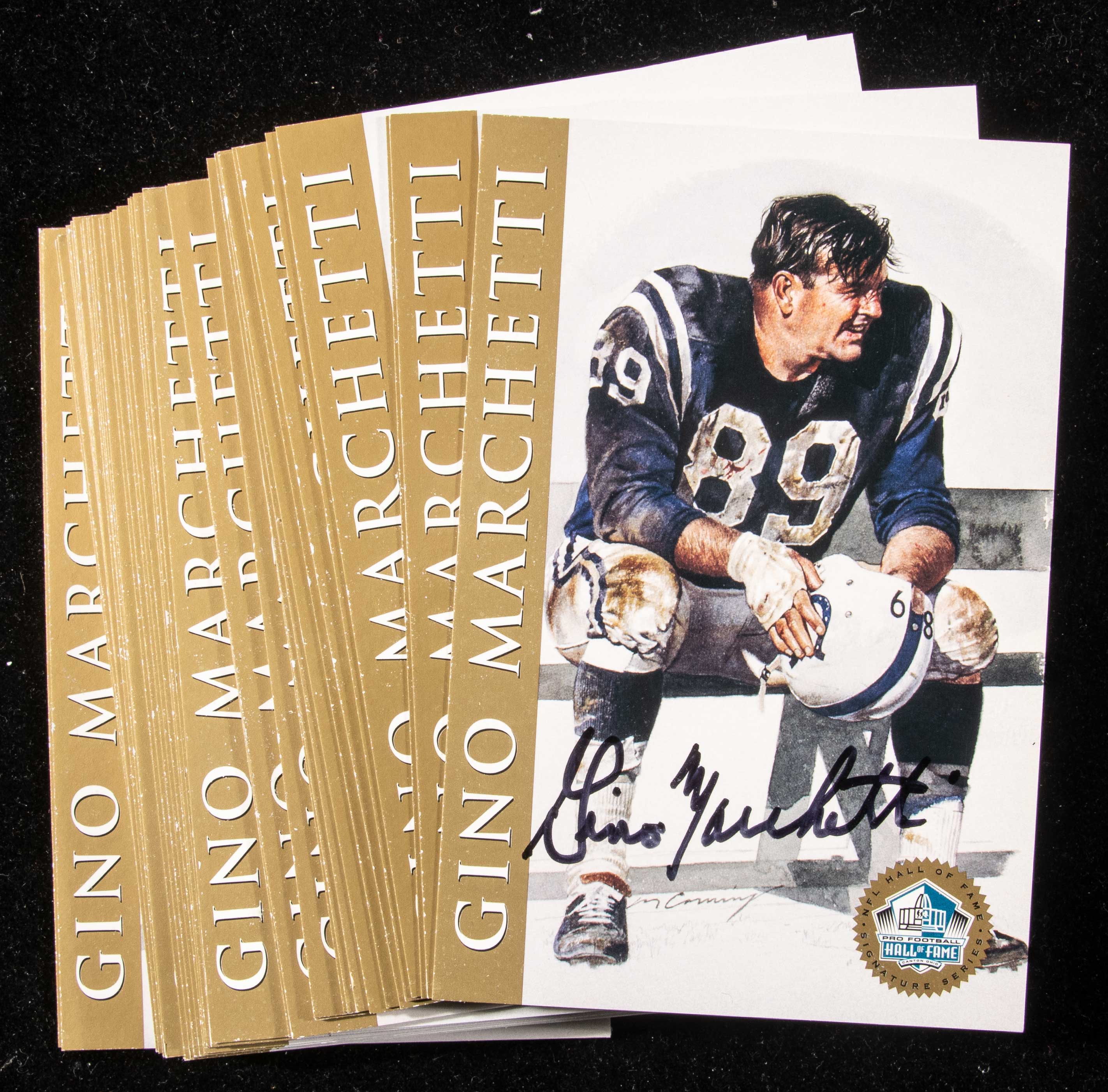 Description:Lot of (50) Gino Marchetti autographed Pro Football Hall of Fame Signature Series cards. Classic color issue utilizing the original artwork of Merv Corning with each card sign in blue or black sharpie by Marchetti across the front. Includes auction LOA from JSA and letter of provenance from Joan Marchetti: NM-NM/MT