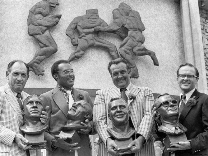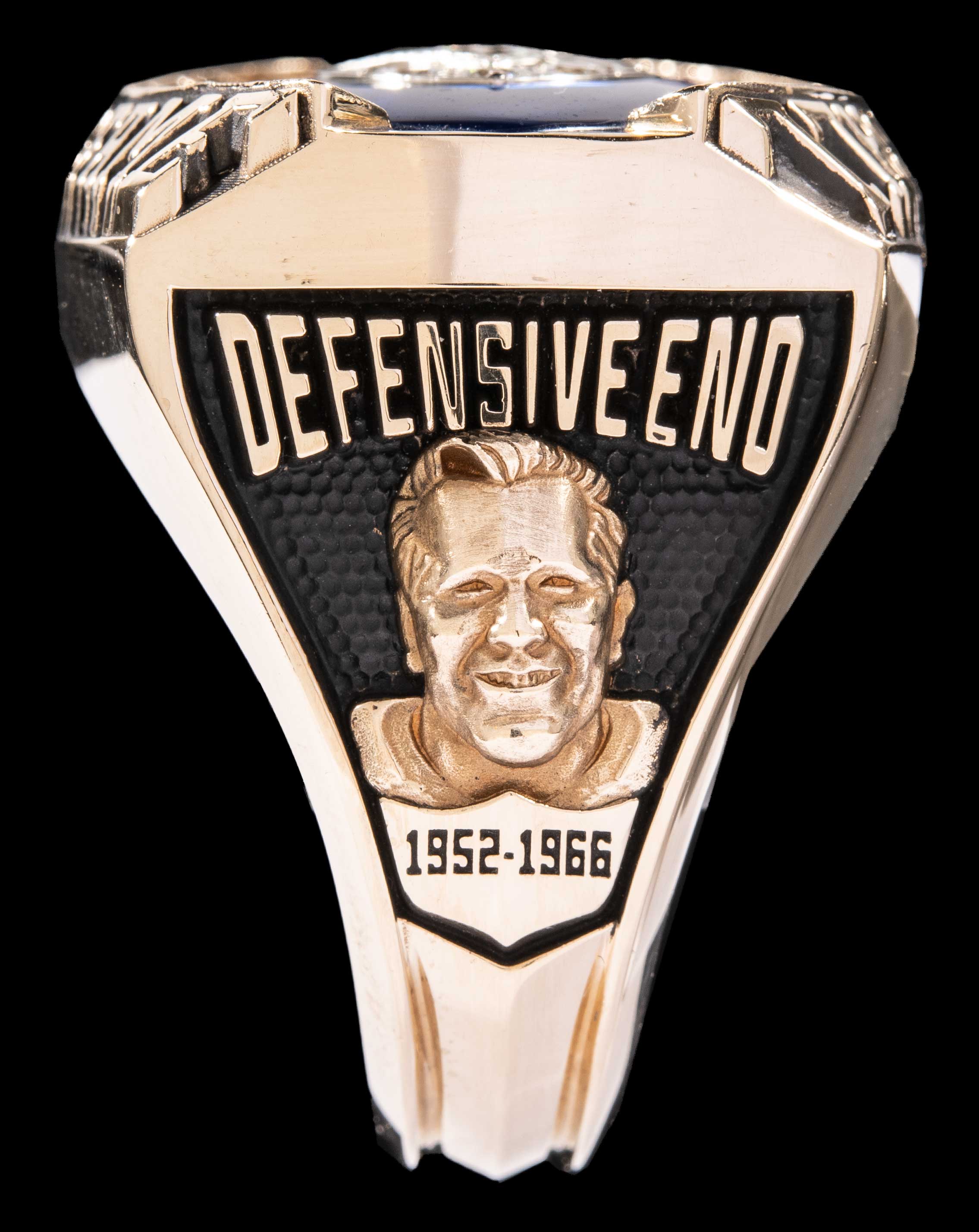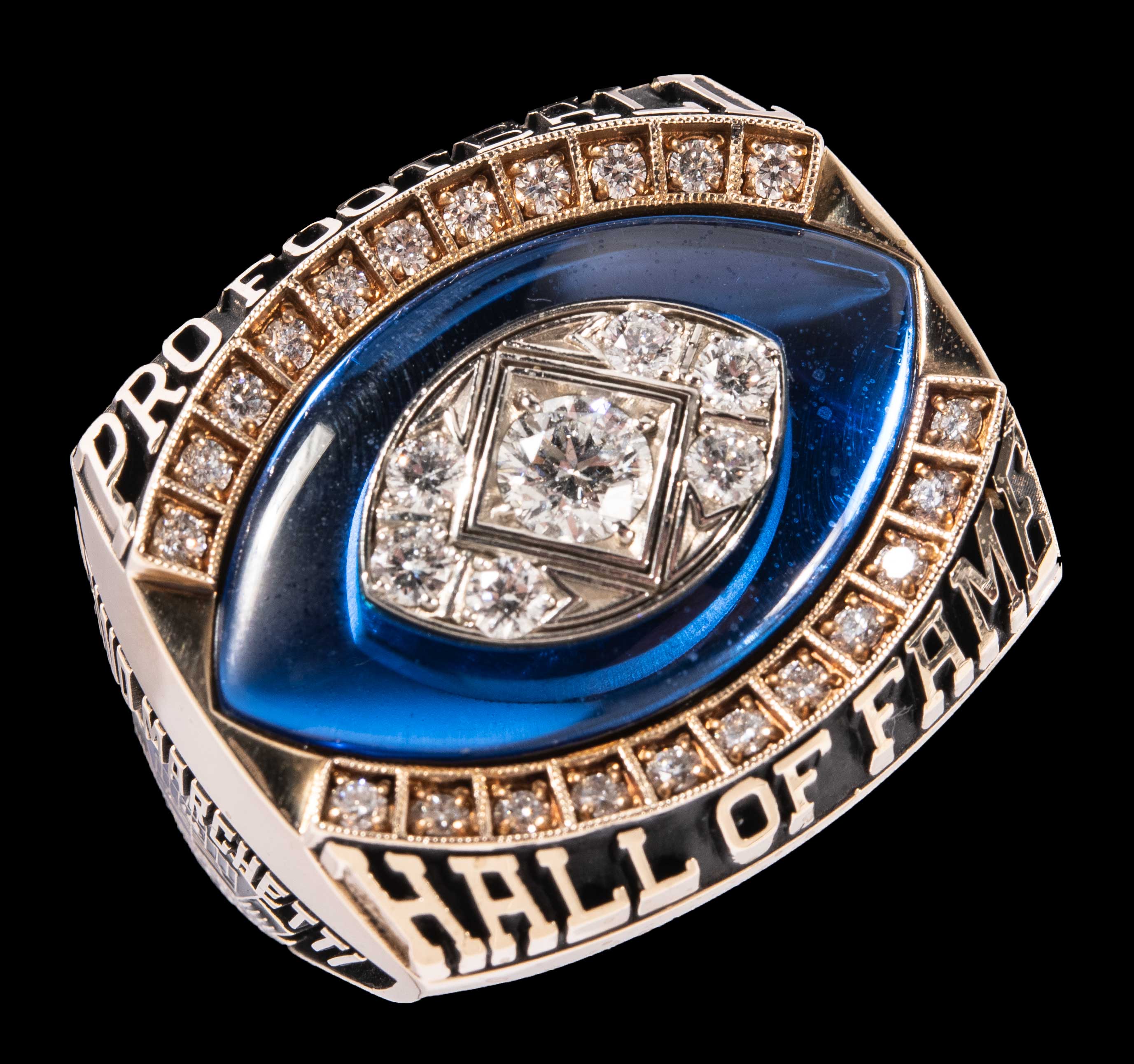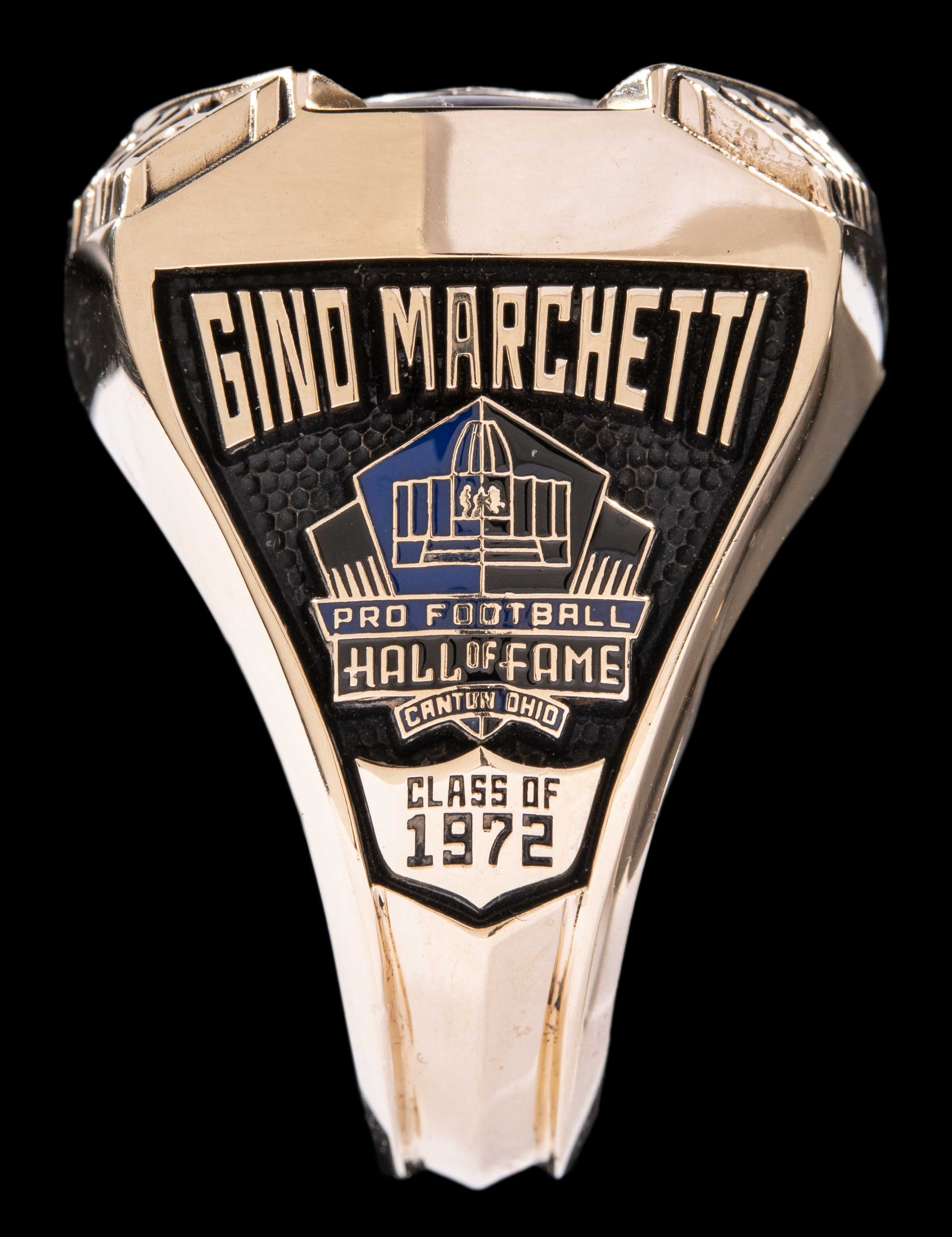Description:Gino Marchetti Pro Football Hall of Fame ring. Exceptional quality presentational ring as given to Gino Marchetti to honor his enshrinement into the Pro Football Hall of Fame. Titled "The Ring of Excellence" the offered ring style is presented to Hall of Fame members beginning in 2013 with stunning eye appeal. Top of the ring features a collection of inset diamonds totaling nearly 1 3/4 carat weights including large solitaire in the center. "Pro Football Hall of Fame" lettering borders a blue field. Side panel displays "Gino Marchetti" titling above image of the Hall of Fame with 1972 enshrinement date. Other side panel features bust image of Marchetti with his position listed above. Interior ring band is engraved "Gino Marchetti 72" along with "Art Carved 14K" hallmarks. The ring retains its original hinged lid presentational box. Very fine presentational ring with relation to one of the most lauded defensive lineman in the history of the NFL. Includes letter of provenance from Joan Marchetti: NM-MT