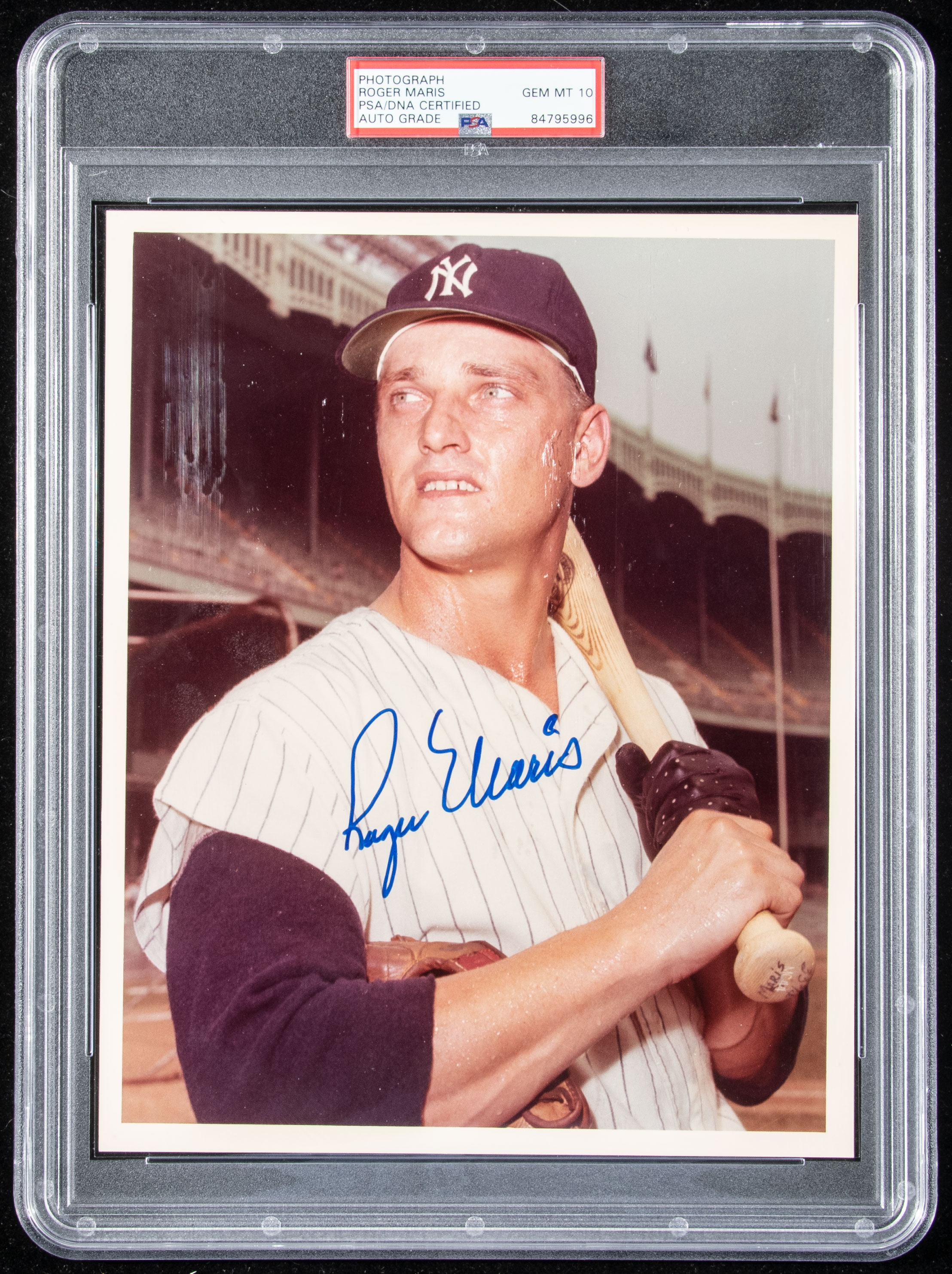 Description:Roger Maris autographed photograph (PSA/DNA 10 GEM MINT). Color 8"x10" photograph picturing Maris in Yankees pinstriped uniform signed across the front in blue sharpie. Signature is extremely bold rating a perfect 10 out of 10. Encapsulated by PSA/DNA (10 GEM MINT)