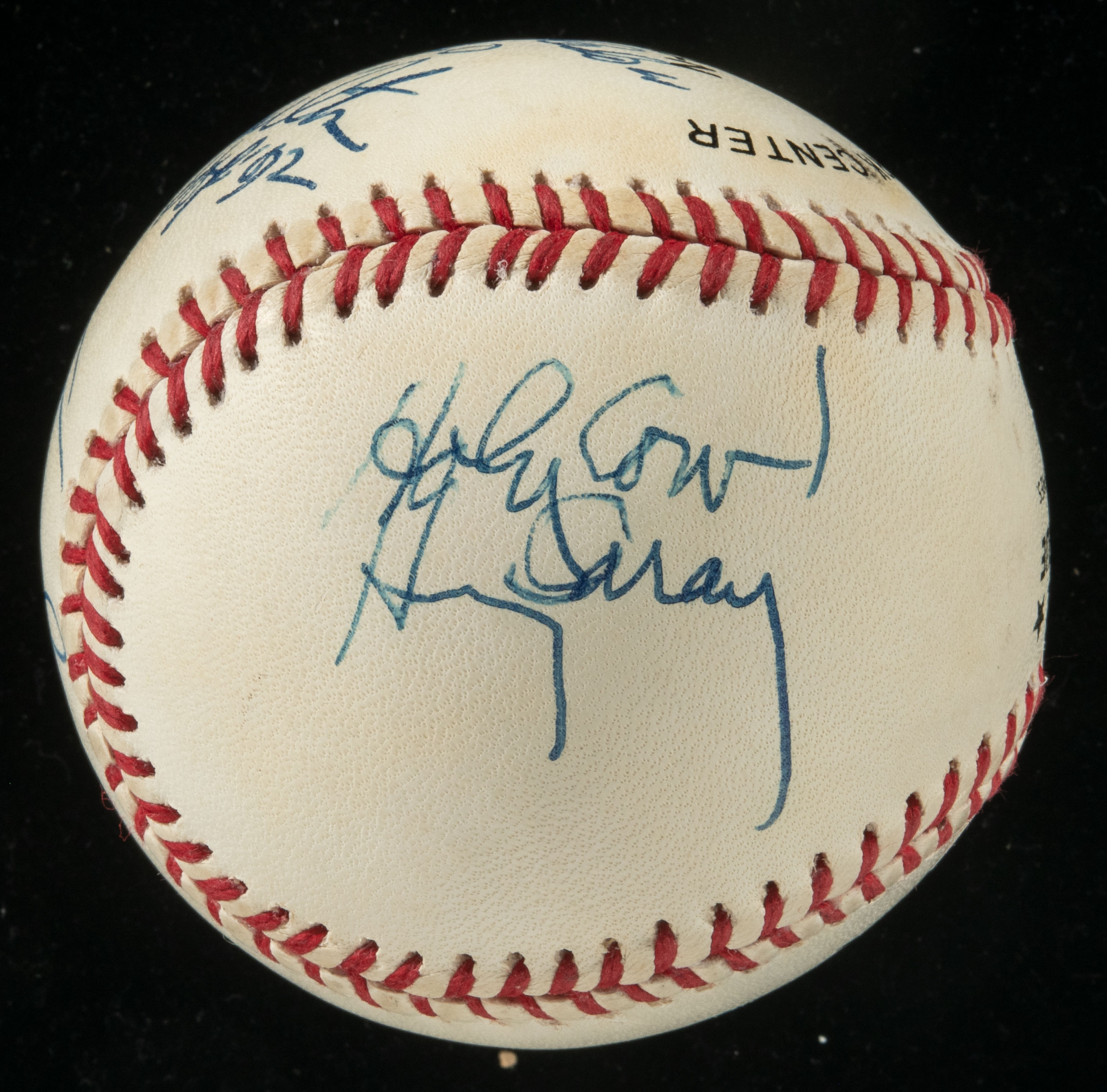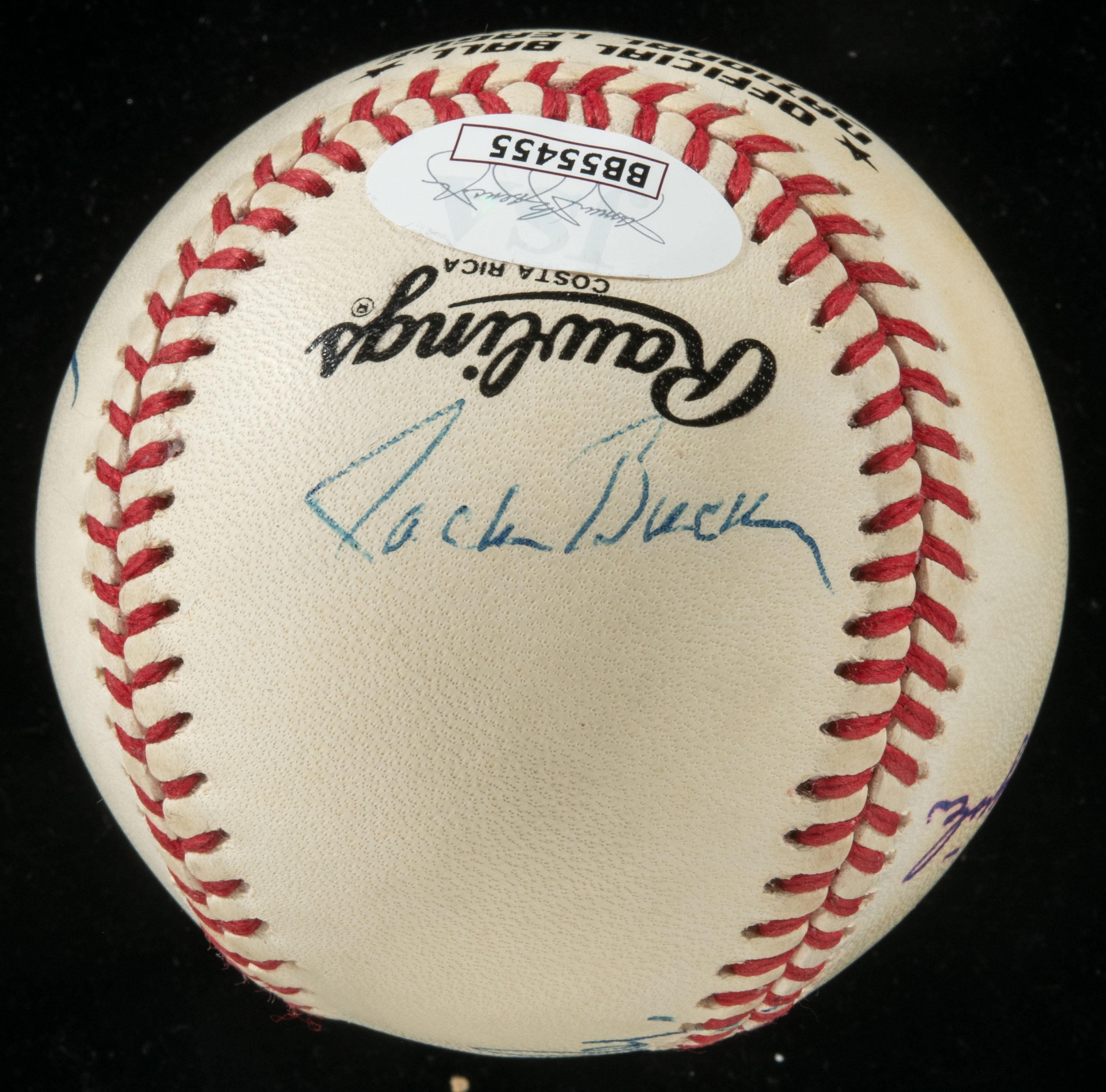 Description:Legendary Announcers autographed baseball. Lightly toned W.White NL ball signed by an incredible combination of iconic baseball announcers to include Vin Scully, Jack Buck, Harry Caray (w/Holy Cow inscr), Milo Hamilton (w/Holy Toledo inscr.), and Joe Garagiola. Sigs range from 8-9 out of 10. Very unique signature baseball showcasing some of the greatest voices in the history of the game. Includes full LOA from JSA: Ball: EX-EX/MT,. Signatures: Range NM-NM/MT
