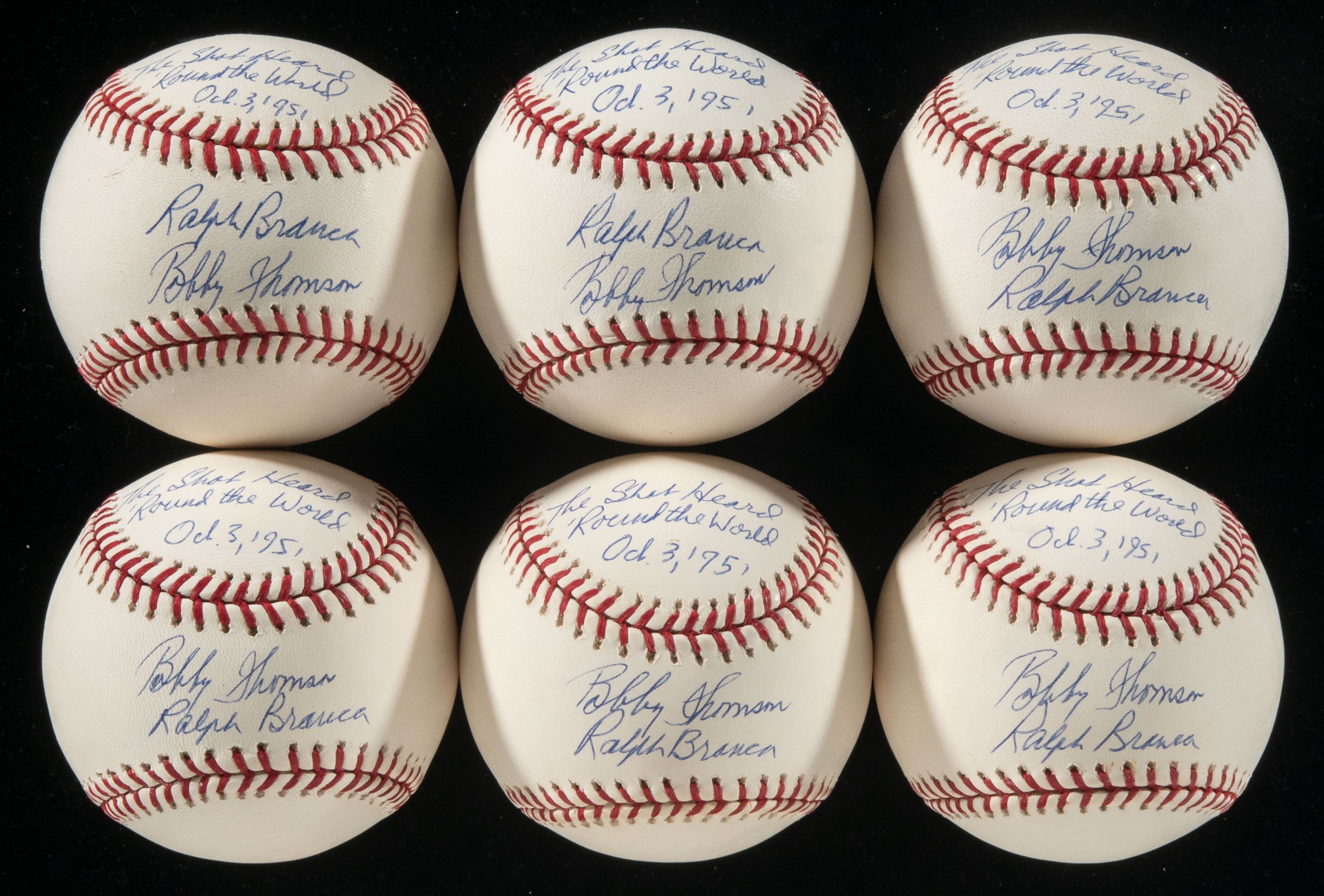 Description:Lot of (24) Ralph Branca and Bobby Thomson "Shot Heard Round The World" autographed baseball. Rawlings B.Selig Official Major League baseballs, each signed by both Thomson (who has inscribed the top panel) and Branca. Ink signatures generally rate 8 out of 10 or better. Baseballs are cleans with a handful having some minute scattered imperfections. Includes auction LOA from JSA and letter of provenance from the Branca Family: EX/MT-NM