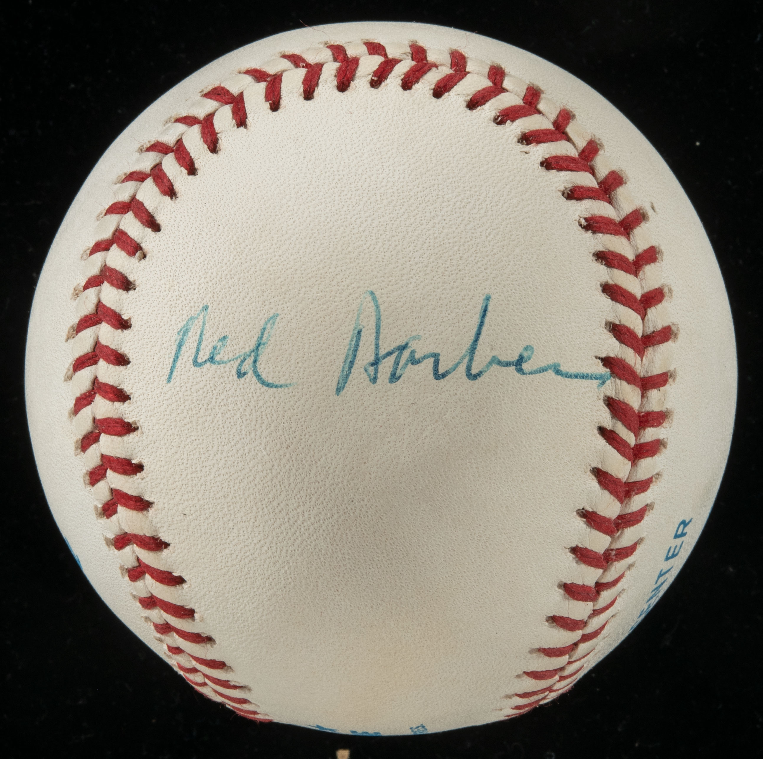 Description:Red Barber single signed baseball. Near white B.Brown AL ball signed on side panel by the legendary Brooklyn Dodgers announcer. Blue signature presents across a side panel rating 8 out of 10. Includes full LOA from JSA: Ball: NM, Signature: NM-MT
