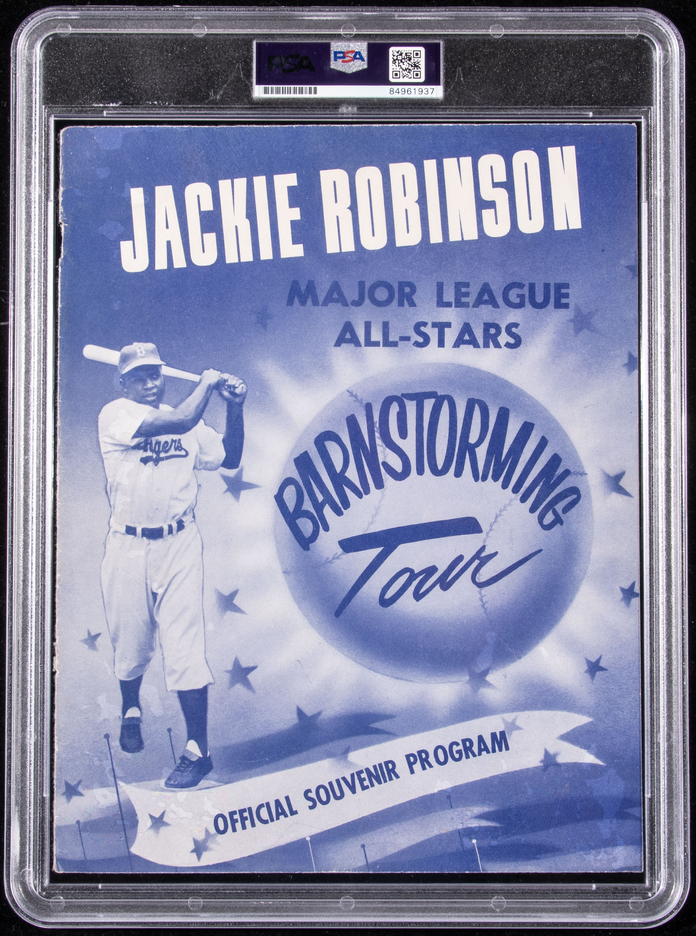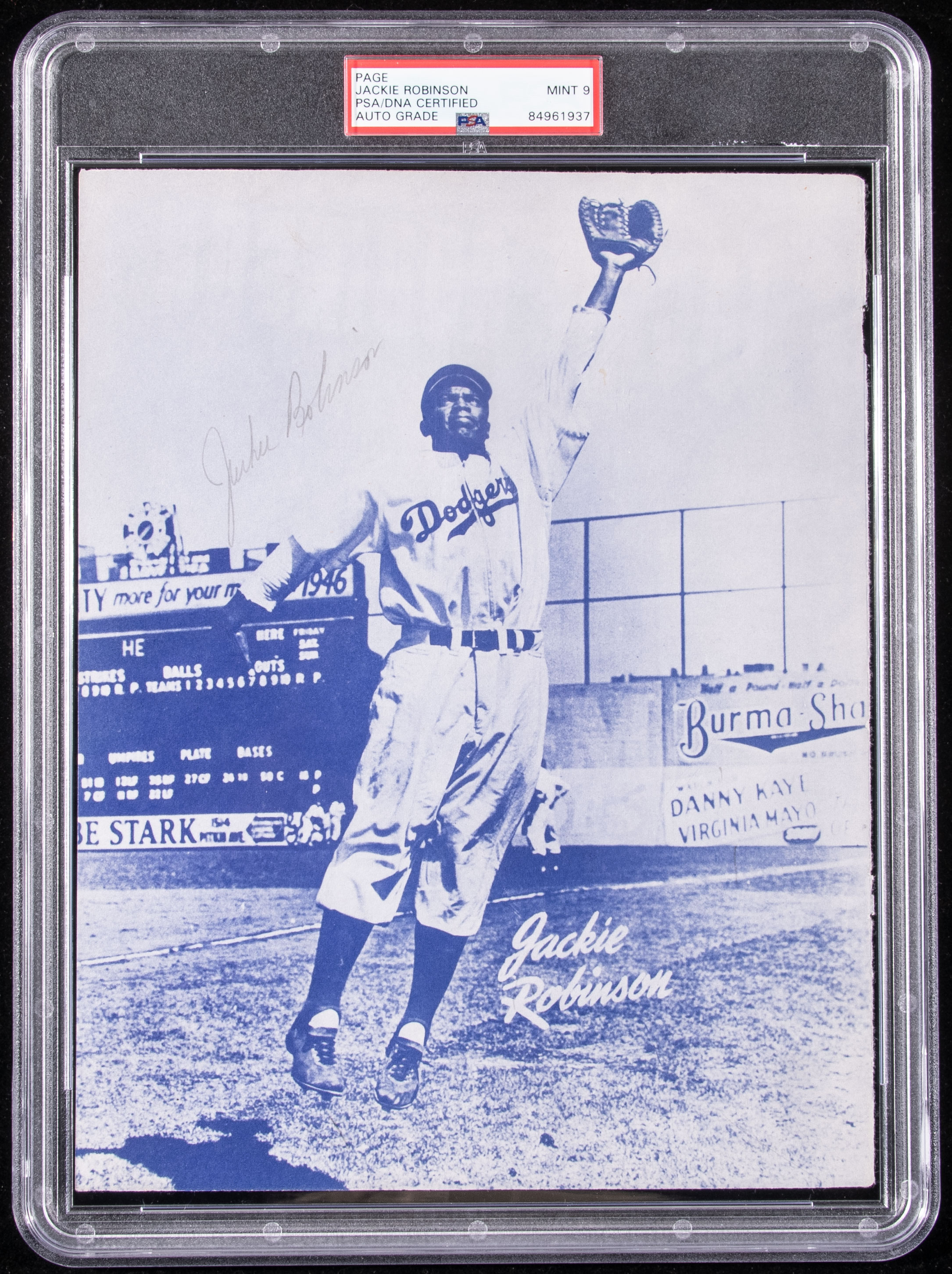 Description:1953 Jackie Robinson autographed photographic display (PSA/DNA 9 MINT). Original interior printed photographic souvenir page from the 1953 "Jackie Robinson Major League All-Stars Barnstorming Tour" program. Blue tinted image shows Robinson leaping for a ball in Brooklyn Dodgers uniform which has been signed by Jackie at top left. Signature rates 9 out of 10. Image measures an impressive 8 1/2"x11" with Robinson photographic program cover on the back. Encapsulated by PSA/DNA (9 MINT)