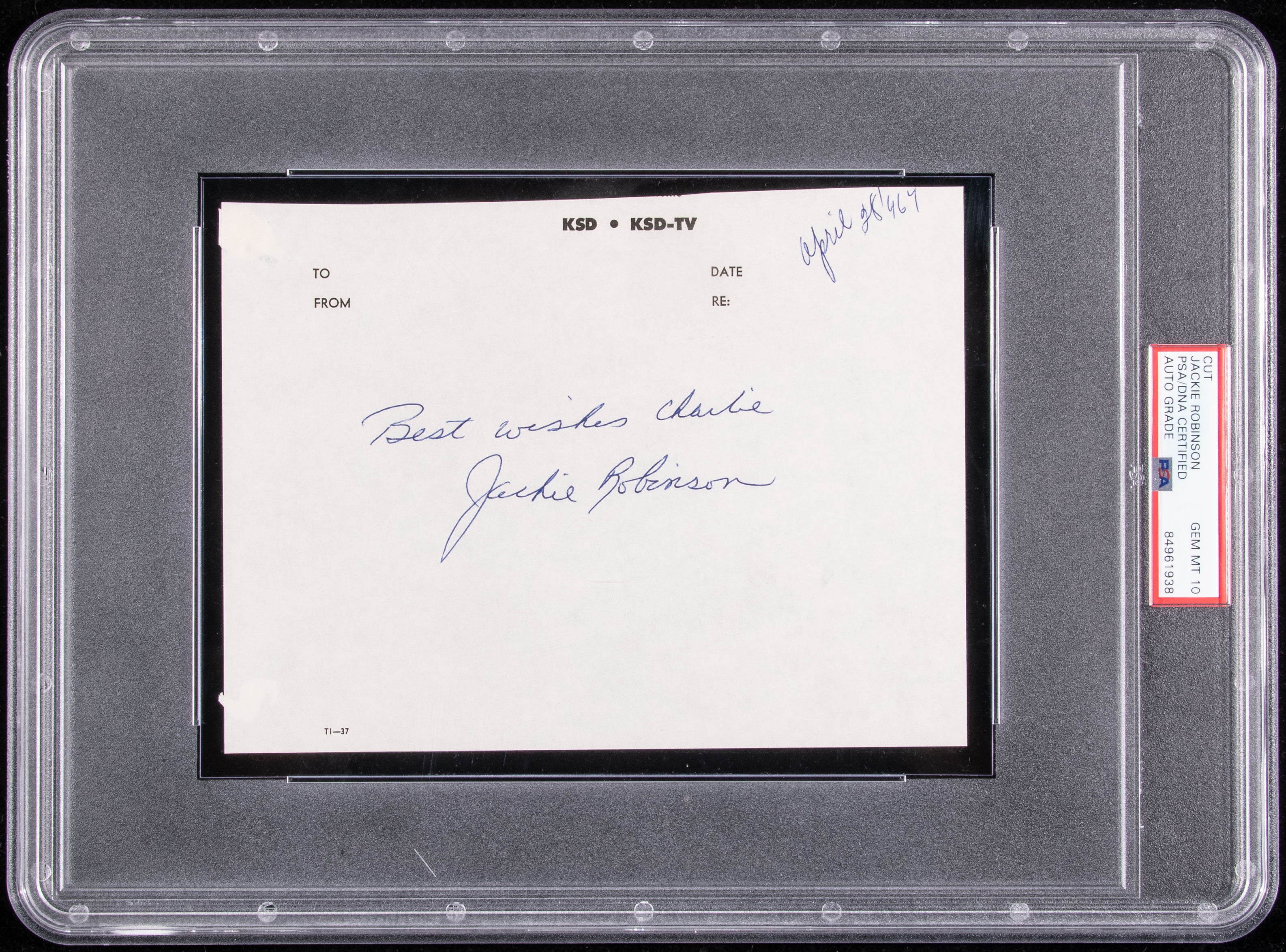 Description:1964 Jackie Robinson autographed and inscribed note (PSA/DNA 10 GEM MINT). Very high condition grade autographed and inscribed note on KSD-TV stationary signed, "Best Wishes Charlie, Jackie Robinson". Blue ink signature and salutation present beautifully against the off white paper rating a perfect 10 out of 10. Note is dated April 28, 1964 at top right corner. Stationary piece measures 6"x8" with two small corner areas on back having scrapbook adhesion residue. Encapsulated by PSA/DNA (10 GEM MINT).
