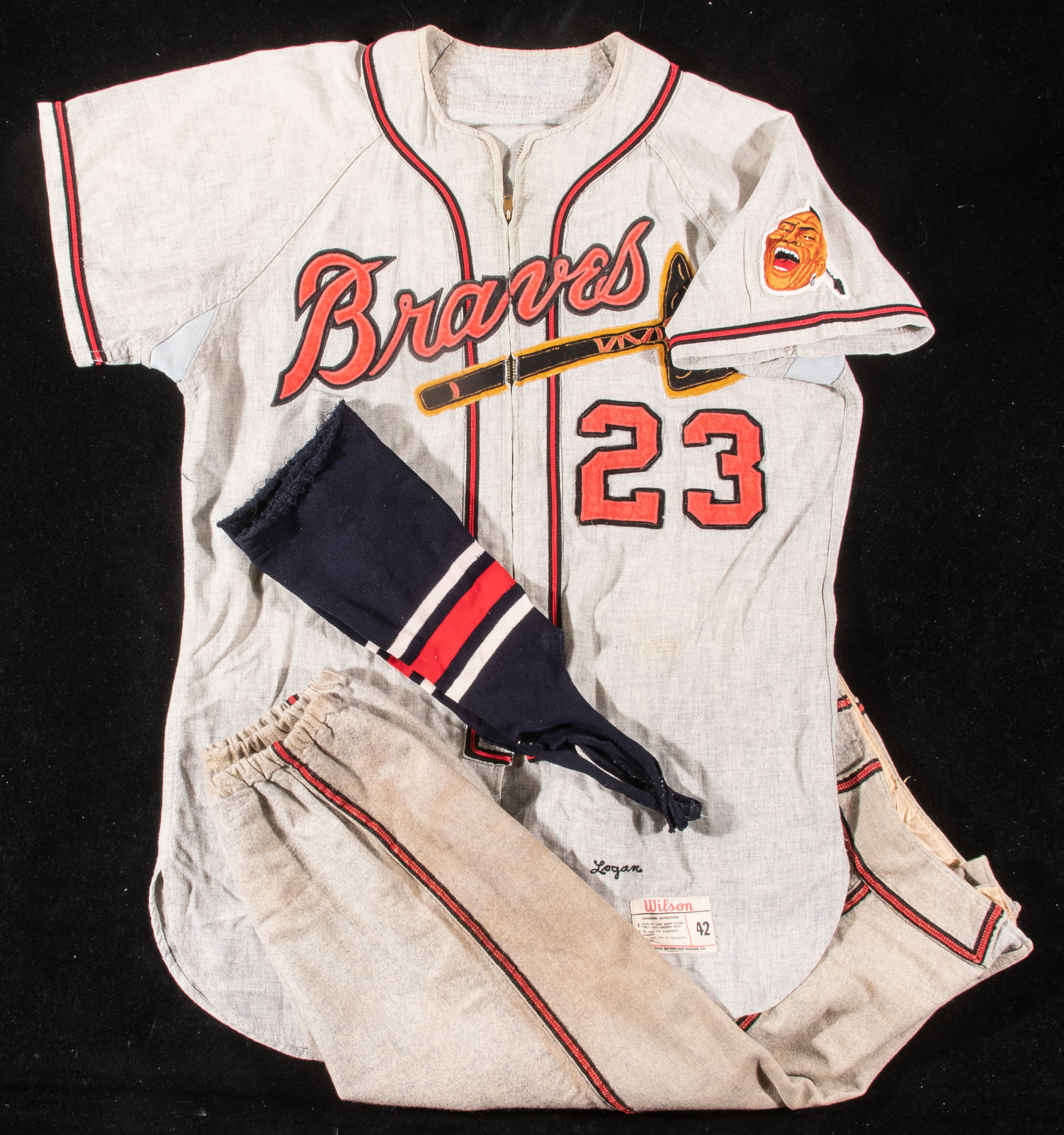 Description:Johnny Logan Milwaukee Braves professional model road jersey with related pants c.1958-61. Grey flannel zipper front jersey having classic "Braves" embroidered team name across the front with "23" on front and back. Proper Wilson manufacturer's label on tail front with size 42 indicator along with "Logan" chain stitched above. Jersey shows evident use including a few small interior hole patches. Lot also includes pair of Milwaukee Braves road grey flannel pants having slightly earlier Rawlings tag with "20" player number strip tag. Pair of similar color scheme stirrup socks are also included which may not be specifically Braves issued. Includes LOA from Hunt Auctions: VG-EX