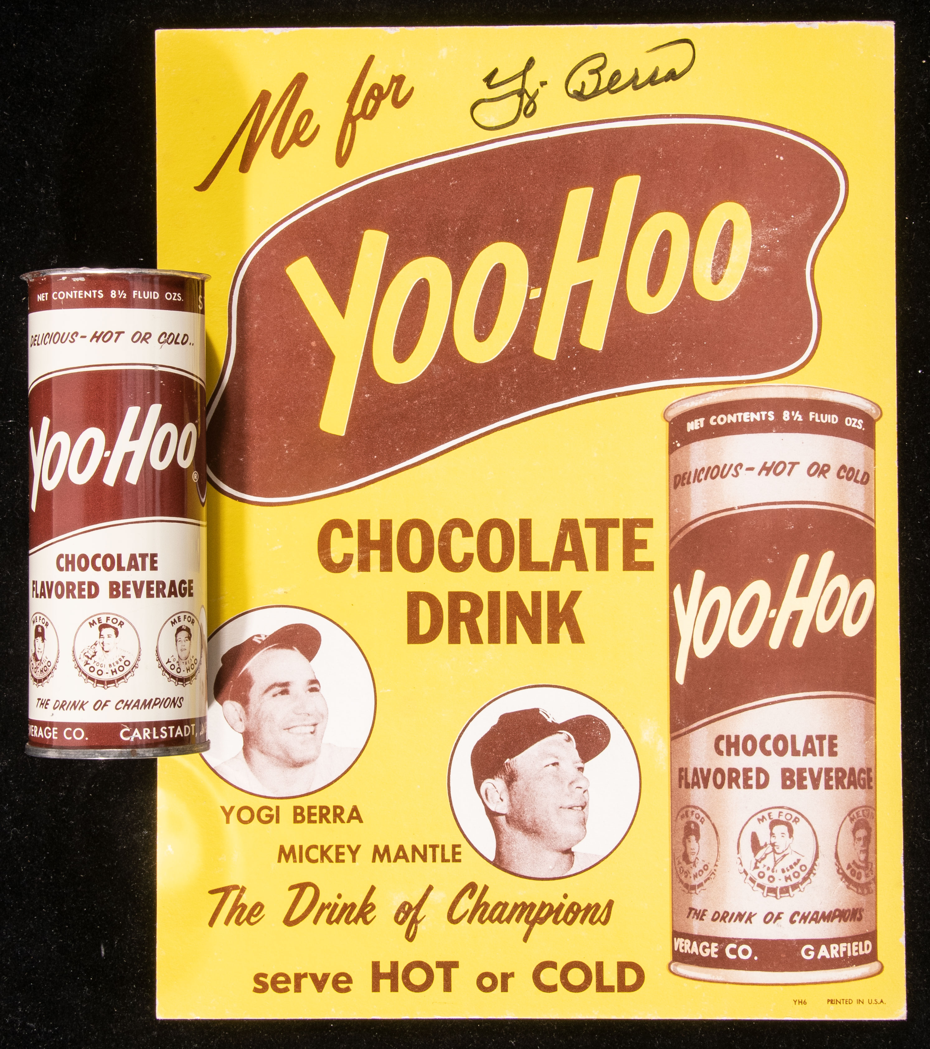 Description:Mickey Mantle and Yogi Berra Yoo-Hoo advertising display (autographed by Berra) with original can c.1960s. Heavy stock 9"x12" point of sale display showing the New York Yankees Hall of Famers promoting Yoo-Hoo. Also included is a period can (empty) which is of the same style as that pictured on the advertising piece. Sign is in very strong overall condition with just a touch of wear to the edges and strips of mounting residue on the top and bottom of back. It has been signed "Yogi Berra" in marker rating 9 out of 10. Can has some light wear. Includes auction LOA from JSA: Sig. NM, Sign/can EX