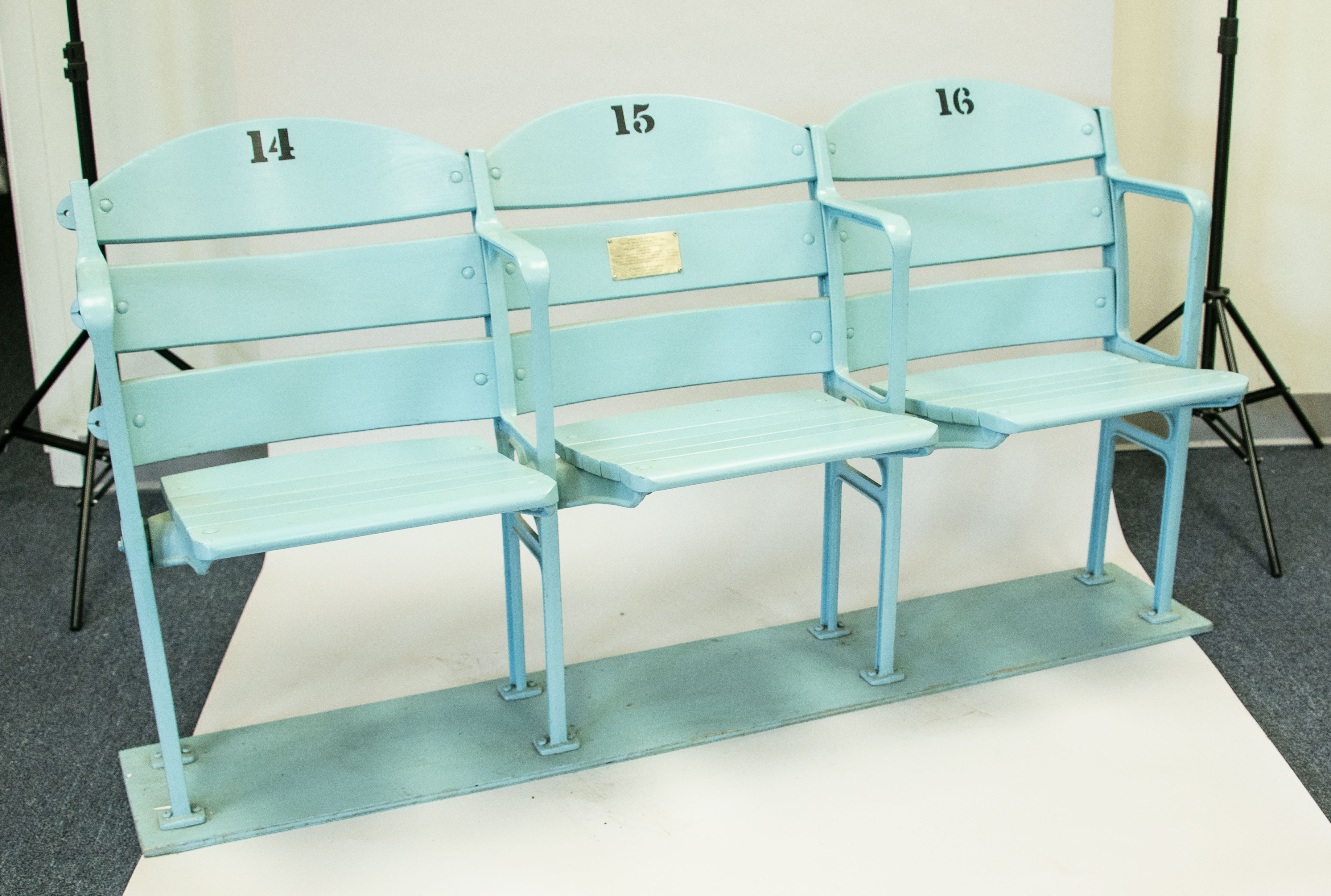 Description:Connie Mack Stadium seats. Row of (3) connected seats are mounted to wooden base and free standing. Restored/refinished with numbers (14, 15, and 16) lettered on upper slats and a descriptive metal placard affixed. Mild general wear consistent with long term use as intended: EX