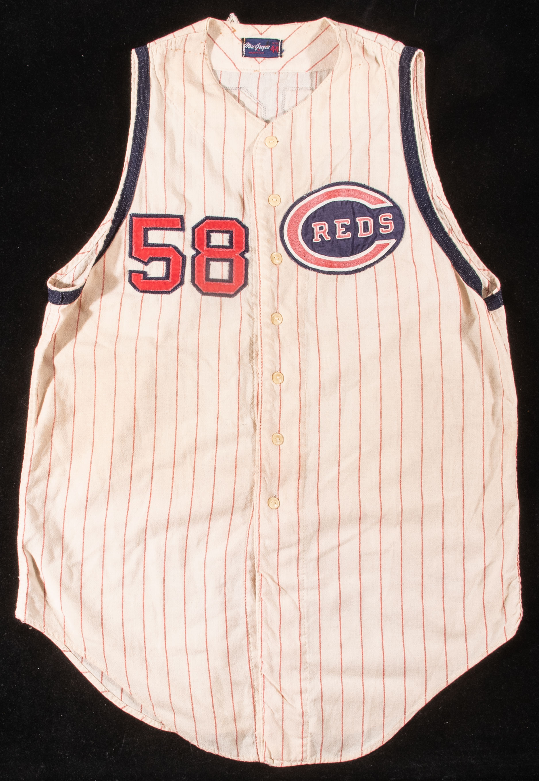 Description:1961 Cincinnati Reds professional model home jersey (NL Champions). Classic pinstriped vest style flannel jersey having "58" and "Reds" team insignia in tackle twill on front with matching "58" on back. The Reds roster does not show a player wearing #58 during the 1961 regular season indicating possible spring training use. Vestiges of player name lettering are found under the "58" on back. MacGregor tag inside collar with size 44 indicator and "Set 1 1961" flag tag inside the tail front. Rare and desirable style type from an important NL team of the 1960s era. Includes LOA from Hunt Auctions: VG-EX