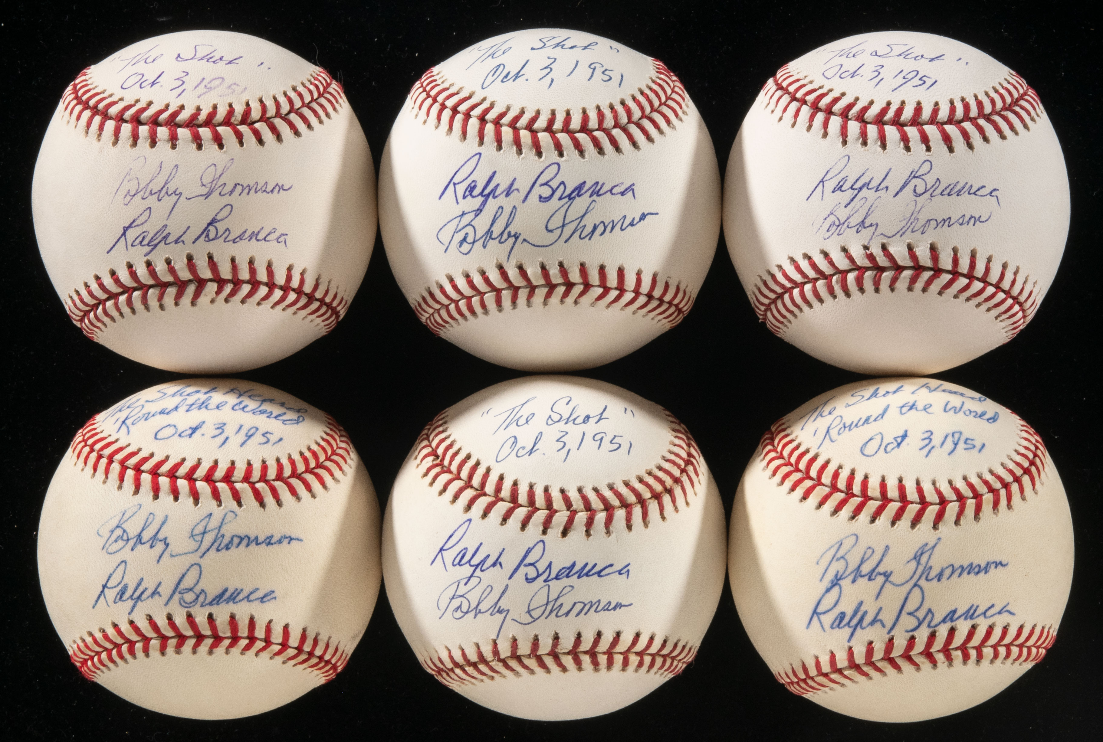 Description:Lot of (24) Ralph Branca and Bobby Thomson "Shot Heard Round The World" autographed baseball. Rawlings B.Selig Official Major League or L.Coleman ONL baseballs, each signed by both Thomson (who has inscribed the top panel) and Branca. Ink signatures generally rate 8 out of 10 or better. While most baseballs are clean, a portion do have light to moderate toning. Includes auction LOA from JSA and letter of provenance from the Branca Family: EX-NM