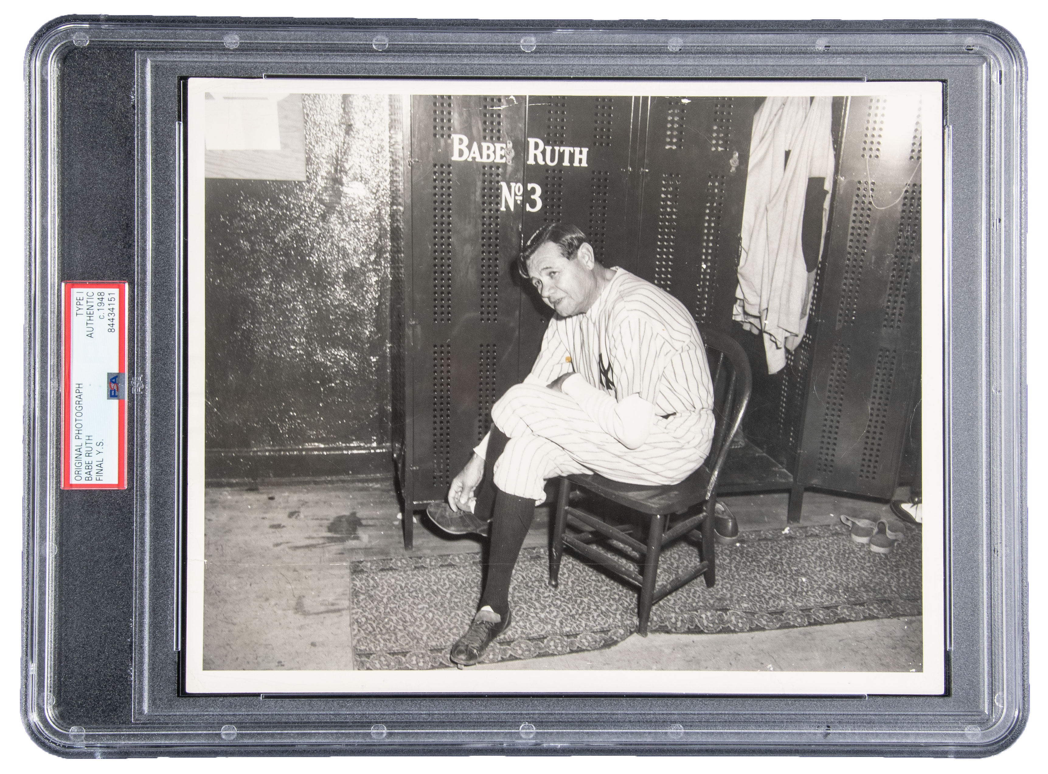 Description:June 13, 1948 Babe Ruth Final Appearance at Yankee Stadium photograph attributed to Ruth's personal photo album (PSA Type I). Iconic 8"x10" black and white image picturing Ruth seated at his locker at Yankee Stadium on the occasion where he appeared for the final time. Clarity and contrast are nearly flawless vividly portraying the Babe in his frailty having been ravaged by throat cancer. The photo originated from the Barry Halper collection and was attributed to having been removed from the photo album personally presented to Ruth after the event. Includes full letter and is encapsulated by PSA/DNA (Type I):NM
