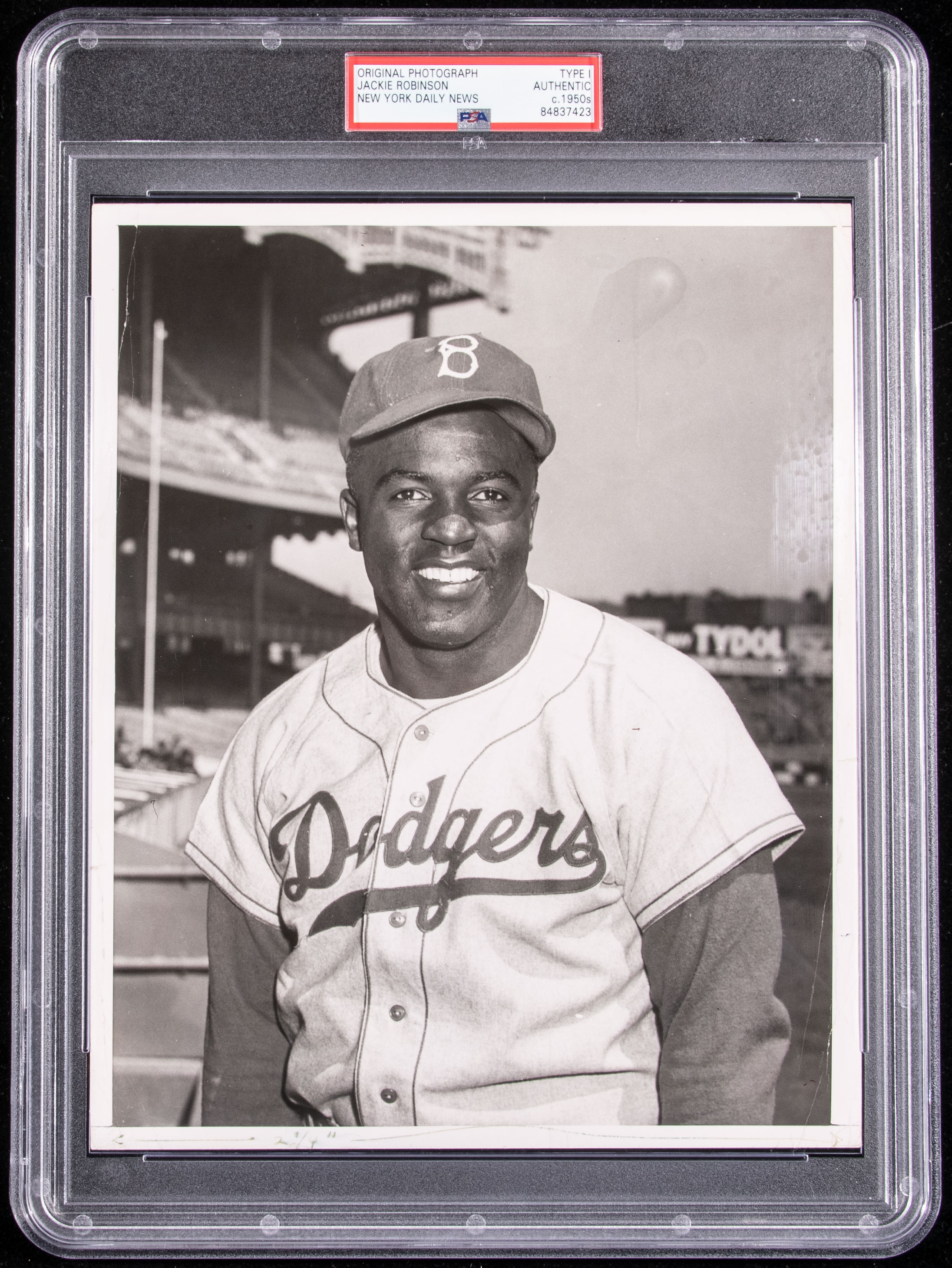 Description:Very fine Jackie Robinson photograph c.1950s (PSA/DNA Type I). Black and white 8"x10" portrait image of Jackie Robinson posed in Brooklyn Dodgers road uniform at Yankee Stadium. Image quality and contrast is exceptional with some surface wrinkling and faded cropping notations both found in the border areas. Stamped by New York Daily News on the reverse. Encapsulated by PSA/DNA (Type I): EX