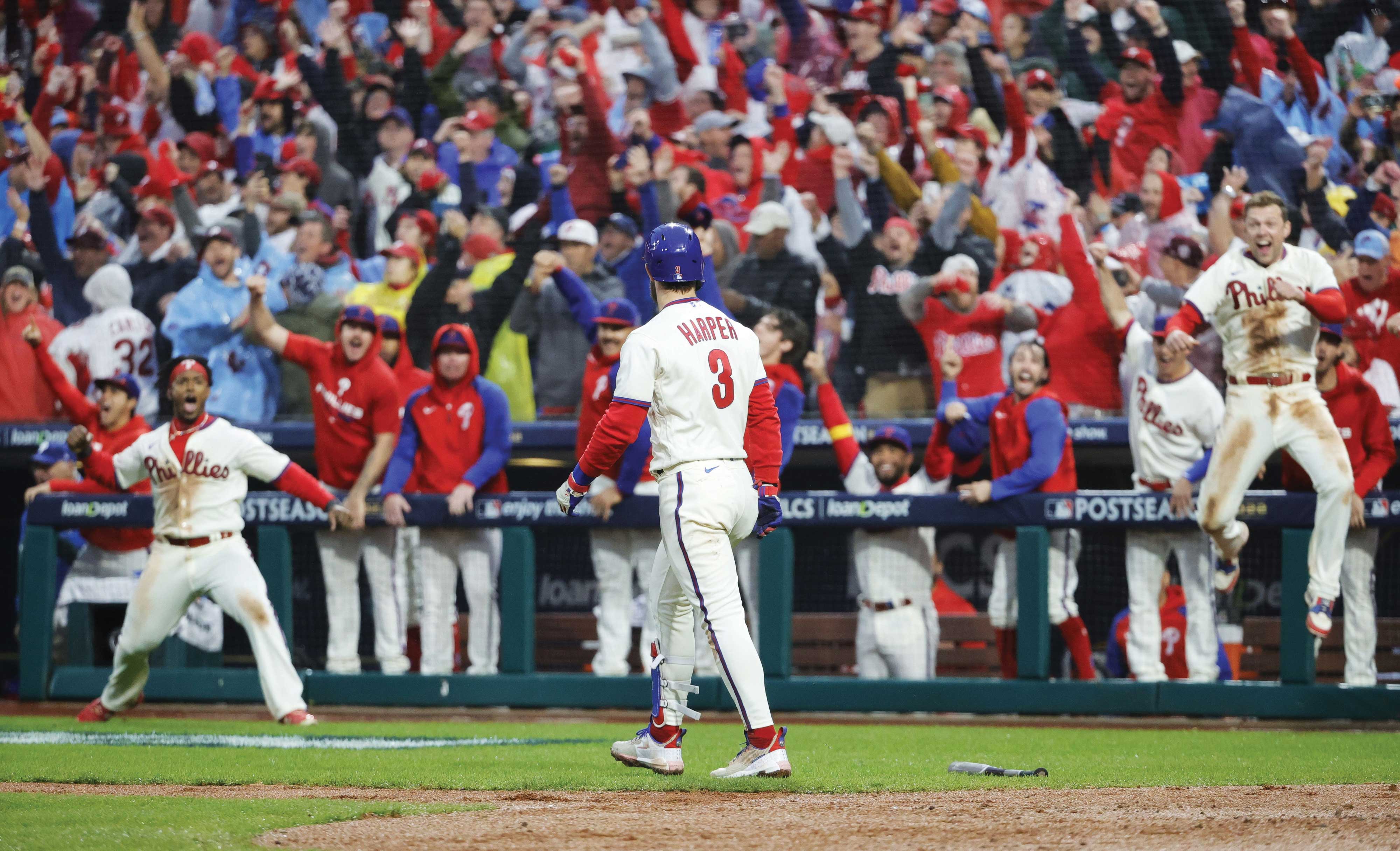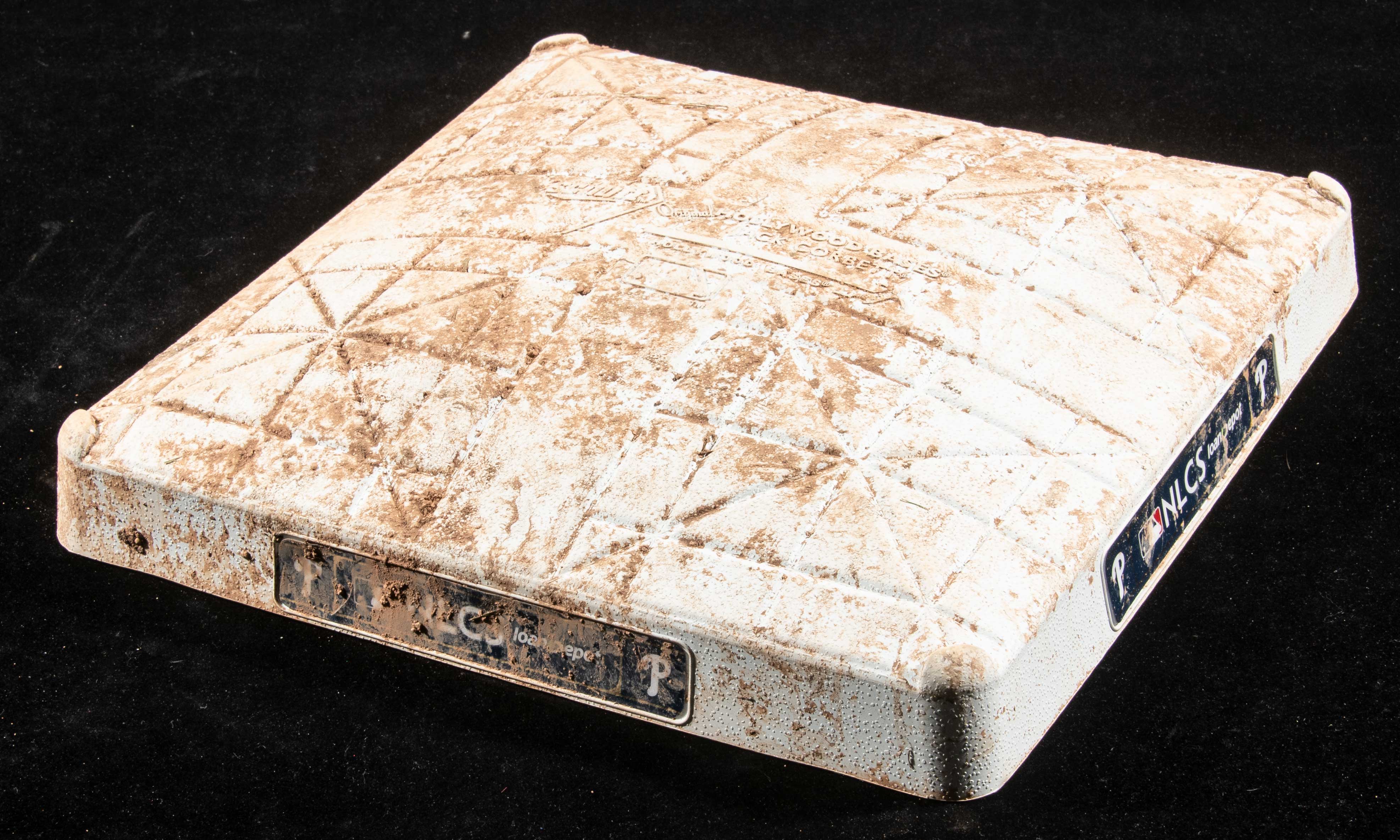 Description:2022 NLCS game used base (Harper "Bedlam at the Bank" game winning home run in Game 5)(NL Champions)(MLB Authentication) 1st base used from innings 7-9 during Game 5 of the NLCS at Citizens Bank Park in which the Phillies defeated the Padres by a score of 4-3 on Bryce Harper's game winning home run in the bottom of the 8th inning. MLB Authenticated serial #YP004411 (CQS) hologram sticker is on the base: EX