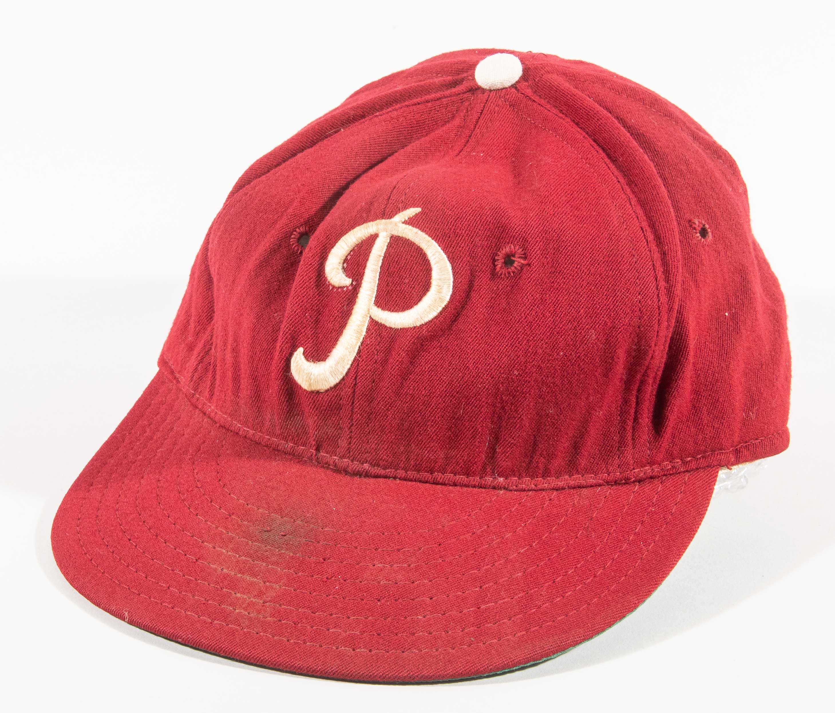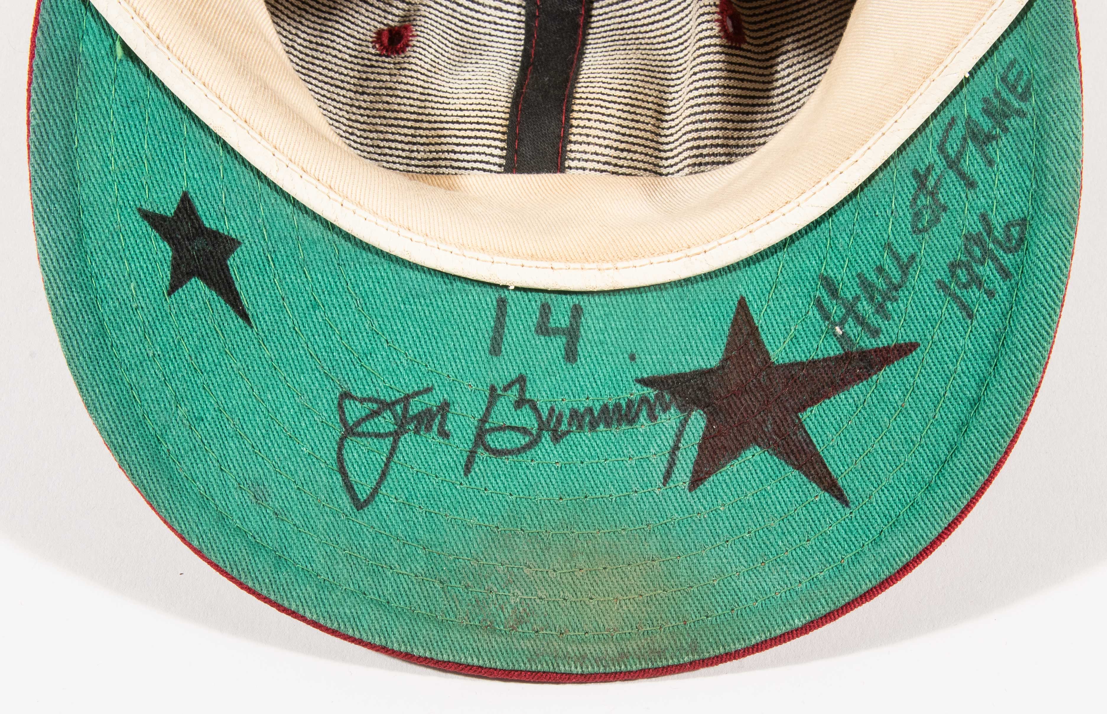 Description:Jim Bunning attributed autographed 1965 Philadelphia Phillies professional model hat. Wilson "Professional Cap" size 7-3/8 Phillies hat with "HWC" date code stamped under the band, and #14 written under the brim. Bunning signed the hat in black marker ("Hall of Fame 1996" likely not written by Bunning). Signature rates 8 out of 10. Stains on the brim and around the sweatband, along with some star designs drawn under the brim. Includes LOA from Hunt Auctions: EX