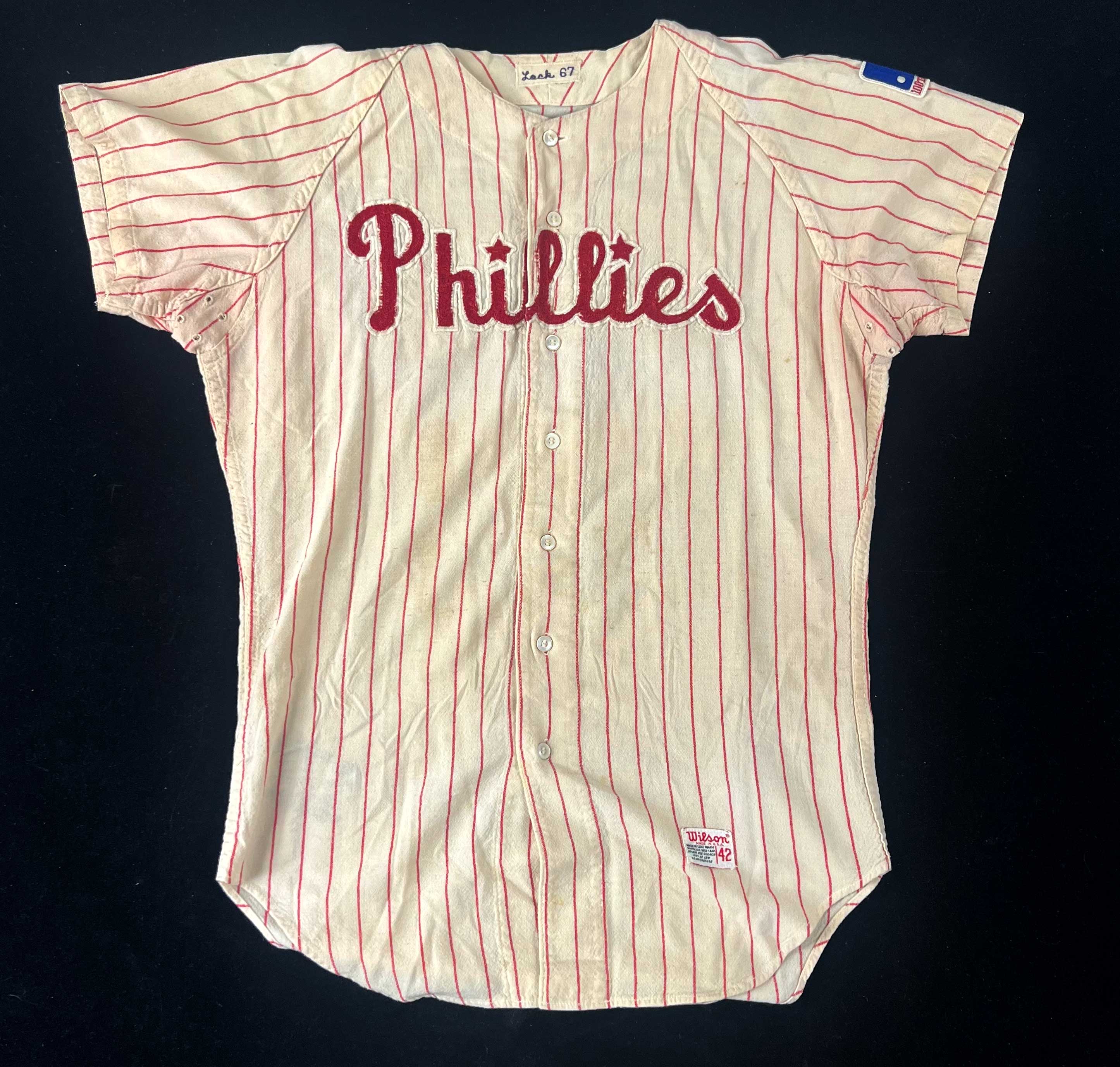 Description:Don Lock professional model Philadelphia Phillies jersey, c.1967-69. Home pinstriped jersey with "Phillies" sewn across the front and #23 sewn on the back. "Lock 67" embroidered strip tag appears in the collar, and Wilson size 42 tag is on the front tail. Original 1969 MLB 100th Anniversary patch is on left sleeve. Lock played with the Phillies from 1967 (the year which collar tag in this jersey indicates) through a short 4-game stint in 1969 when the Anniversary patch was worn by all players. Strong use/wash wear with some minor scattered spotting and fabric pilling. Includes LOA from Hunt Auctions: EX