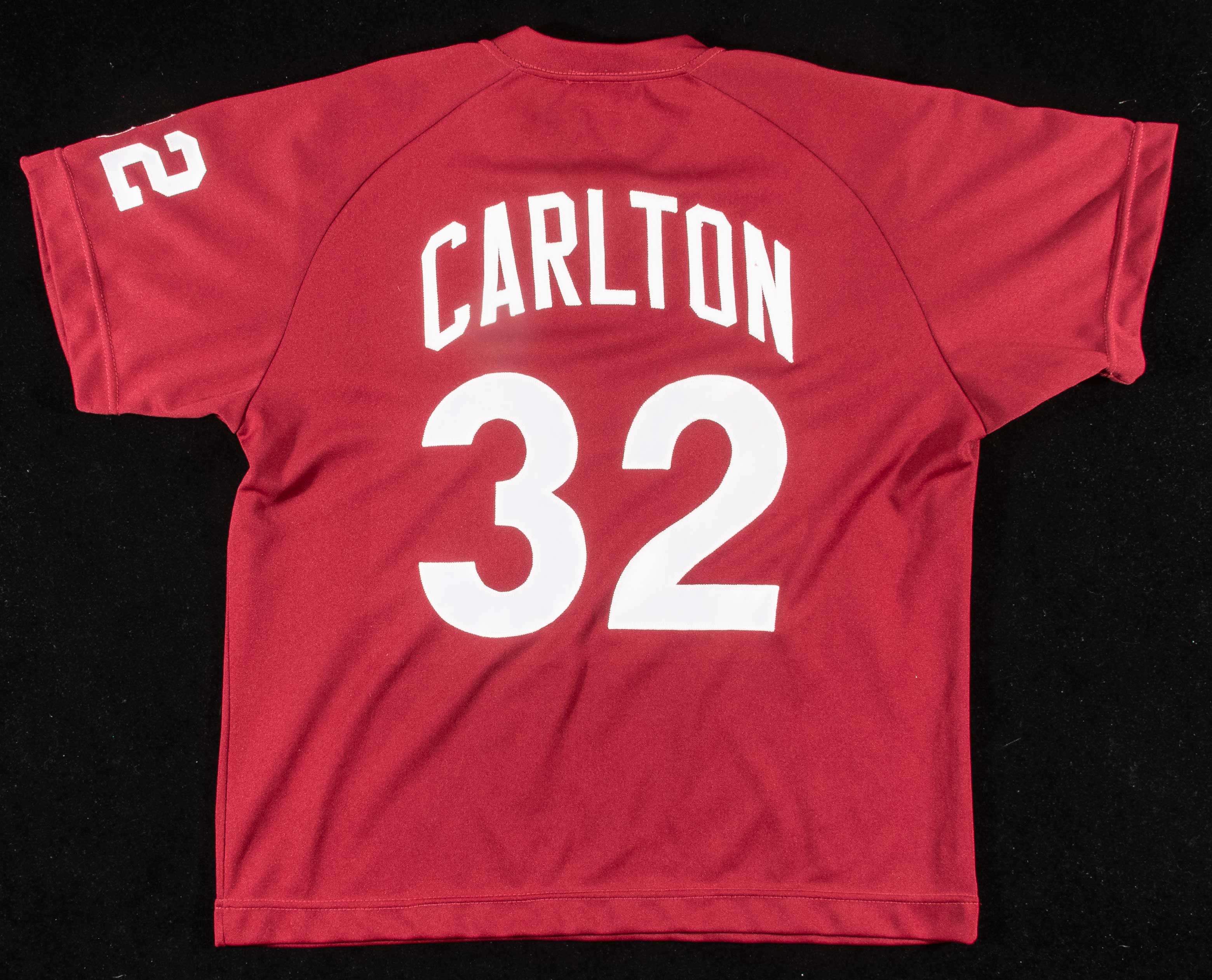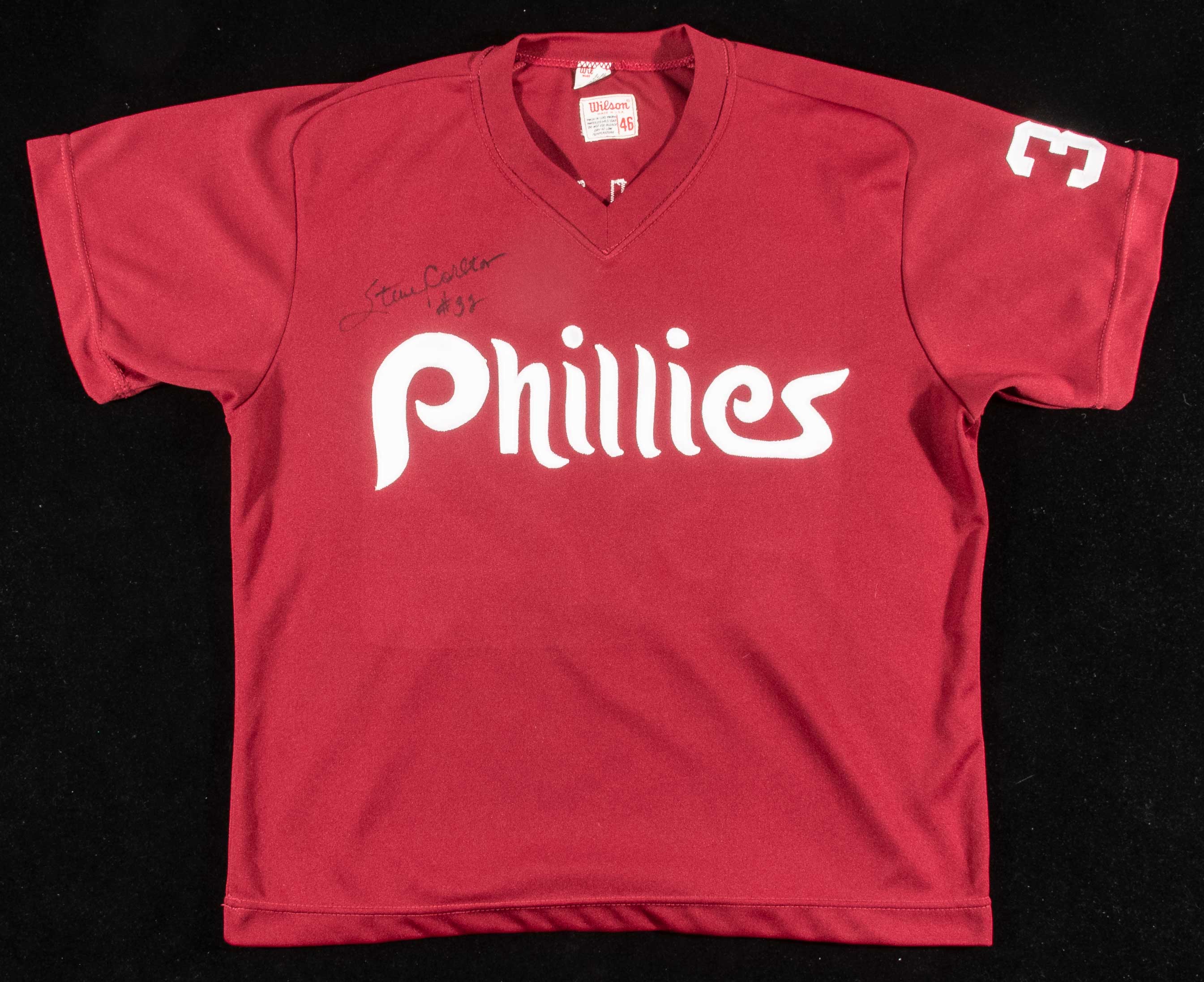 Description:Steve Carlton autographed Philadelphia Phillies professional model batting practice jersey, c.1970s. Wilson size 46 pullover jersey with "Phillies" sewn across the front, "CARLTON" and #32 sewn on the back, and #32 sewn on the left sleeve. Carlton signed the jersey in black marker. Signature rates 7/8 out of 10. Light overall use/wash wear. Includes LOA from Hunt Auctions: EX/MT