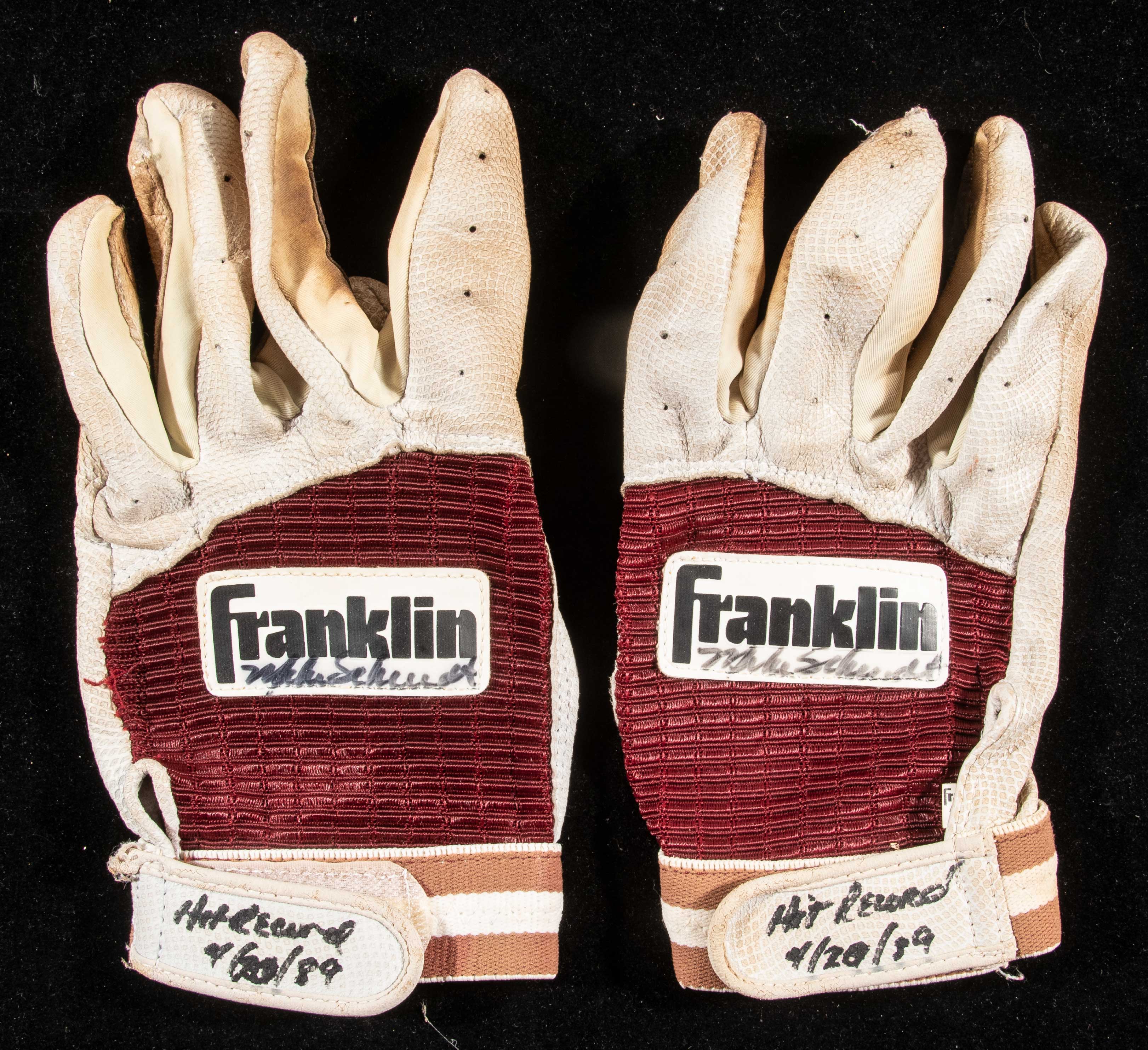 Description:Significant 1989 Mike Schmidt autographed professional model batting gloves attributed to record breaking hit game. Pair of Franklin batting gloves signed by Schmidt in black marker with "Hit Record 4/20/89" inscription added to both. Signatures rate 7 to 8 out of 10. Schmidt broke Richie Ashburn's team record for career hit with his RBI double in the 1st inning of the April 20th game against the Pirates. Outstanding use with pine tar caked on the palms and fingers. Originally obtained by a collector who received items directly from players and team employees in the period, and includes letter of provenance from the original recipient, and LOA from Hunt Auctions: EX