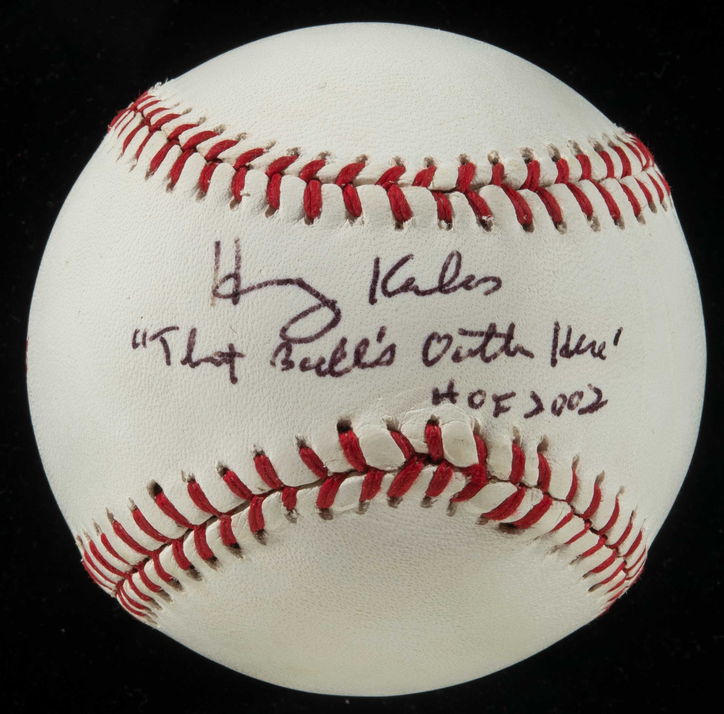 Description:Harry Kalas autographed 1983 Philadelphia Phillies 100th Anniversary baseball. Rawlings SGA Phillies 100th Anniversary logo ball signed by Kalas in black ink with "That Ball's Outta Here" "HOF 2002" inscriptions. Signature rates 8 out of 10. Includes COA from PSA, with matching serial #ed sticker on the ball: NM