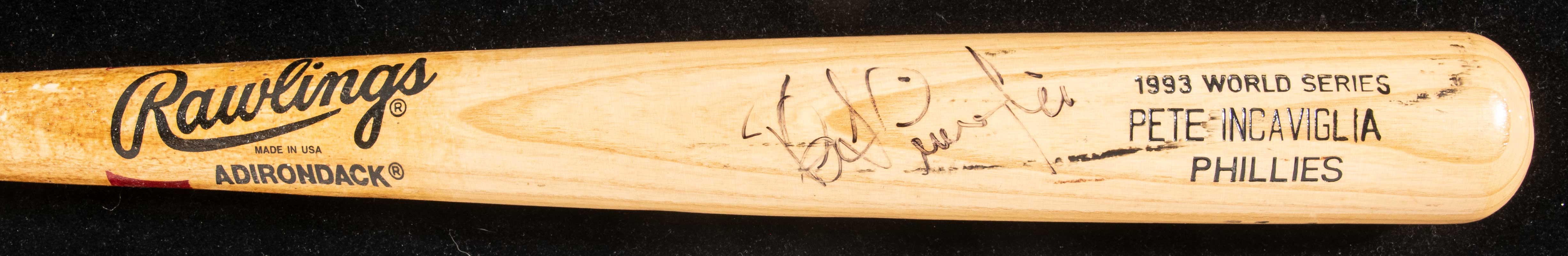 Description:Pete Incaviglia autographed 1993 World Series professional model baseball bat. 35" / 33-oz. Rawlings-Adirondack 225A Pete Incaviglia model bat with his #22 written on the knob and on the end of the bat. "33" (weight) and "INCAVIGLIA" is written on the knob in ink, and the knob is stamped "W/S" along with the model number. Incaviglia signed the bat in black marker. Signature rates 6/7 out of 10. Marvelous use with wear around the barrel, rack marks, and pine tar. Includes LOA from Hunt Auctions: EX