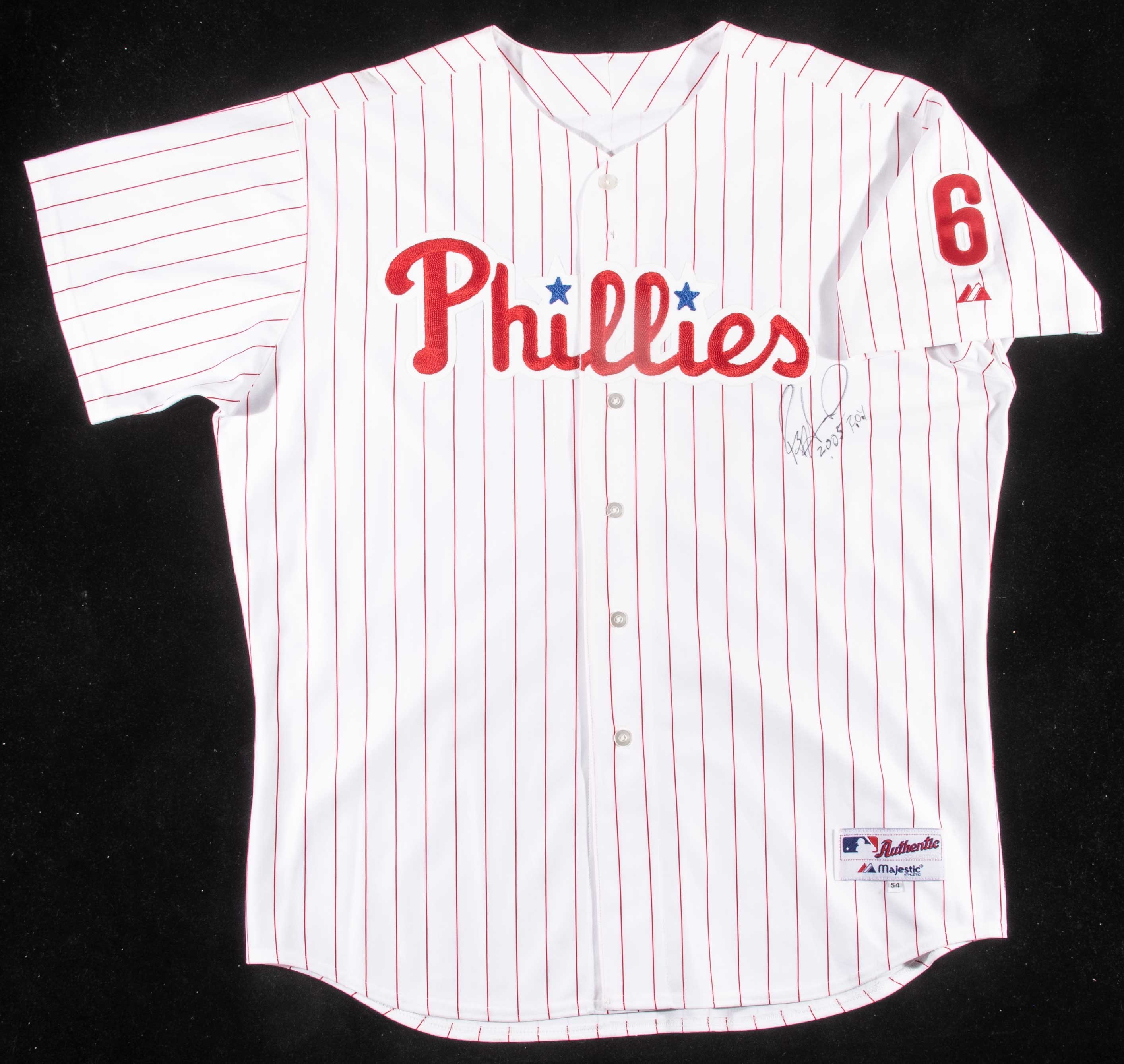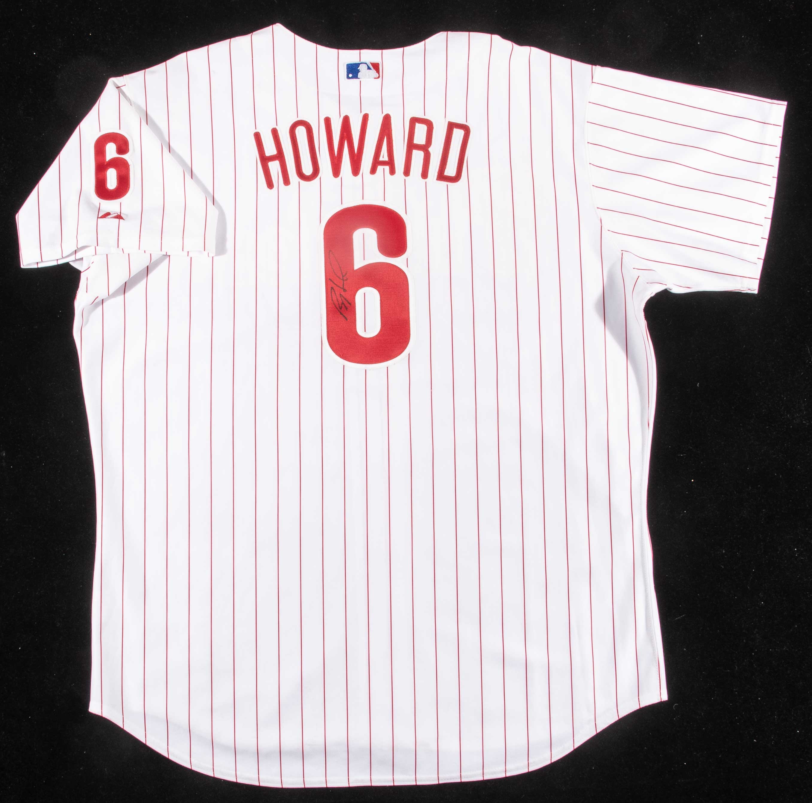 Description:Ryan Howard autographed Philadelphia Phillies professional model jersey, c.2005. Majestic MLB Authentic Collection size 54 jersey with "Phillies" sewn across the front, along with "HOWARD" and #6 sewn on the back, and #6 also sewn on the left sleeve. 0062 code is on the wash tag ("05" written on wash tag), and Majestic tag is on the front tail with size "54" flag tag. Howard signed the front in black marker and added "2005 ROY" inscription, and also signed the back in black marker. Signatures rate 8 to 8/9 out of 10. Light overall use/wash wear. Originally obtained by a collector who received items directly from players and team employees in the period, and includes letter of provenance from the original recipient, and LOA from Hunt Auctions: EX/MT