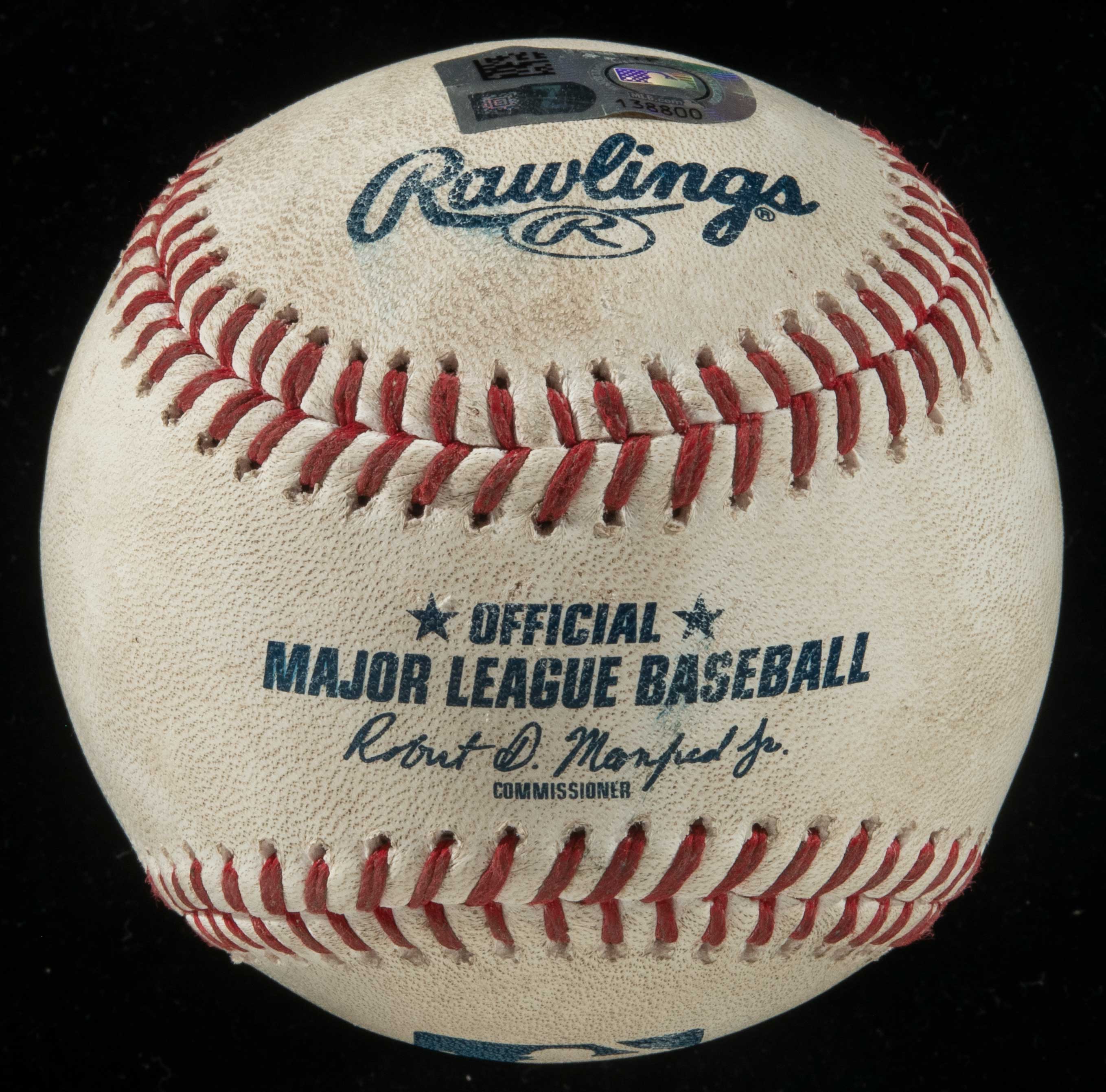 Description:2022 NLCS game used baseball (Harper RBI double)(NL Champions) Rawlings official MLB ball used during Game 4 of the NLCS at Citizens Bank Park. The ball was hit by Bryce Harper for a RBI double in the 1st inning, and the Phillies would go on to defeat the Padres by a score of 10-6. MLB Authenticated serial #YP138800 (JTZ) hologram sticker is on the ball: EX