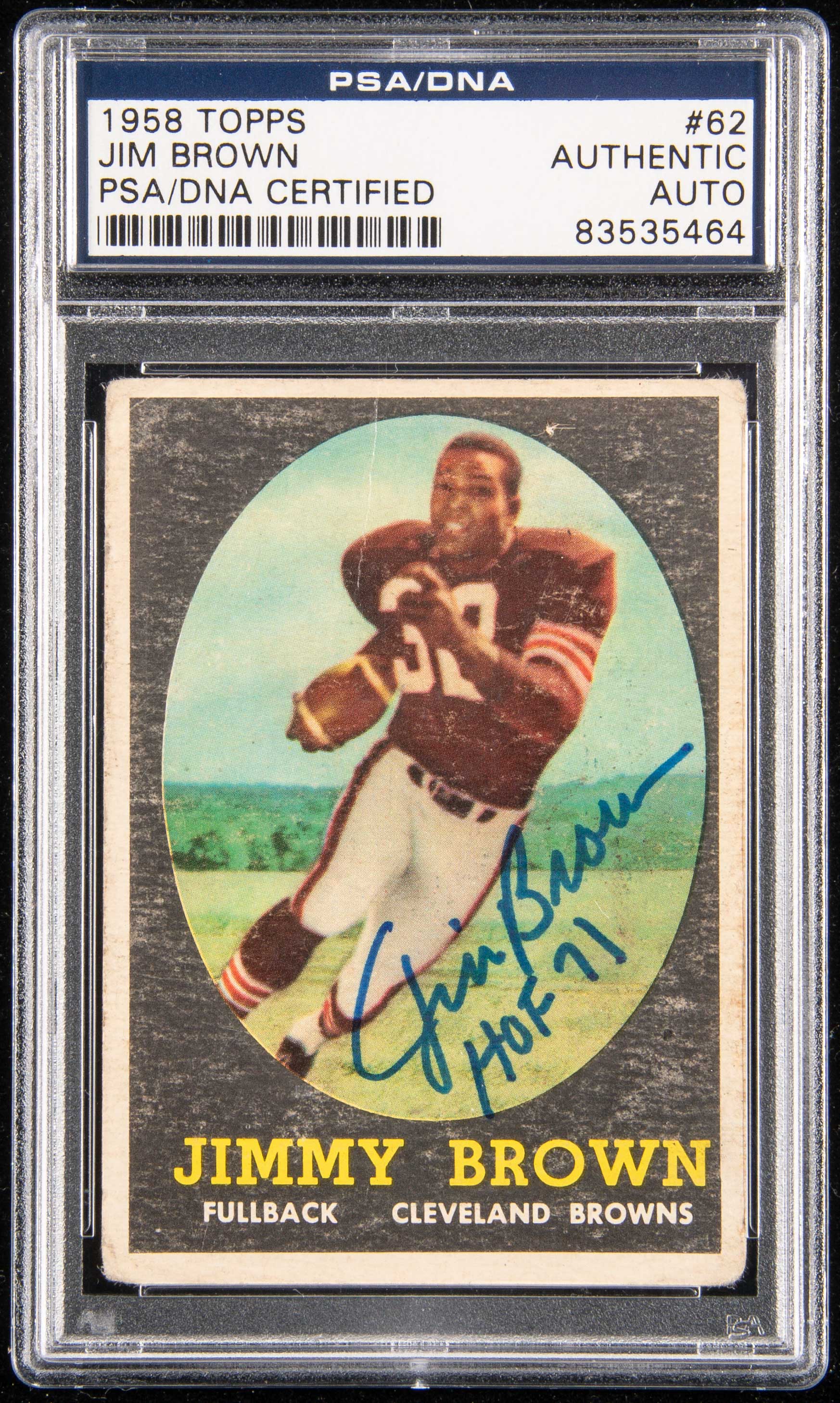 1958 Topps #62 Jim Brown autographed Rookie. Iconic Rookie card has been signed "Jim Brown HOF 71" in blue marker rating 9/10 out of 10. General wear to corners, edges, and surface. Authenticated and encapsulated by PSA: Sig. NM, Card FR