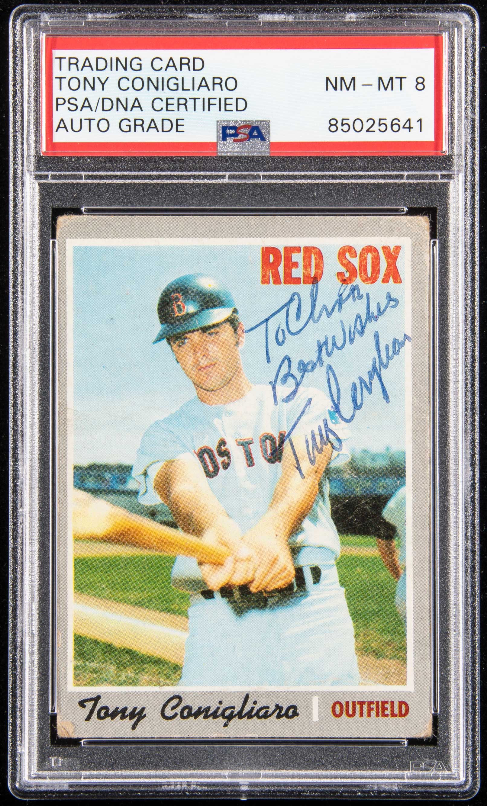 1970 Topps #340 Tony Conigliaro autographed card. Vintage Topps card has been personalized and signed in ink with the autograph graded "NM-MT 8" by PSA. Scattered wear including creases: Sig. PSA NM-MT 8, Card FR