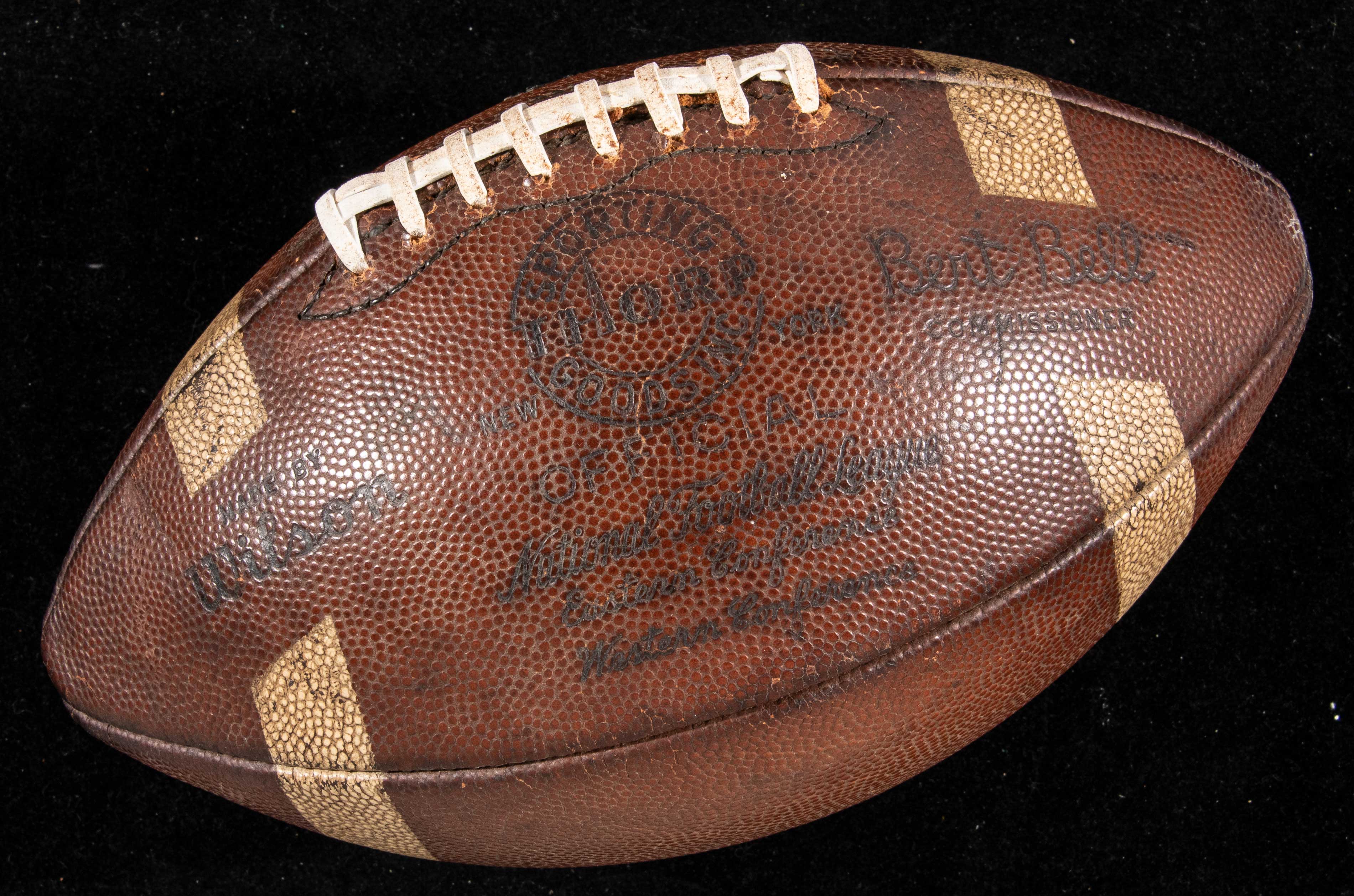 Description:Bert Bell NFL professional model football c.1950s (White Stripe Variant). Strong eye appeal on this touch early NFL "The Duke" model football with Wilson and Thorp Sporting Goods stampings next to Bert Bell facsimile signature. White stripes remain largely intact at either end of the ball which has replaced lacings and interior bladder. Some touch ups to the stampings: VG-EX