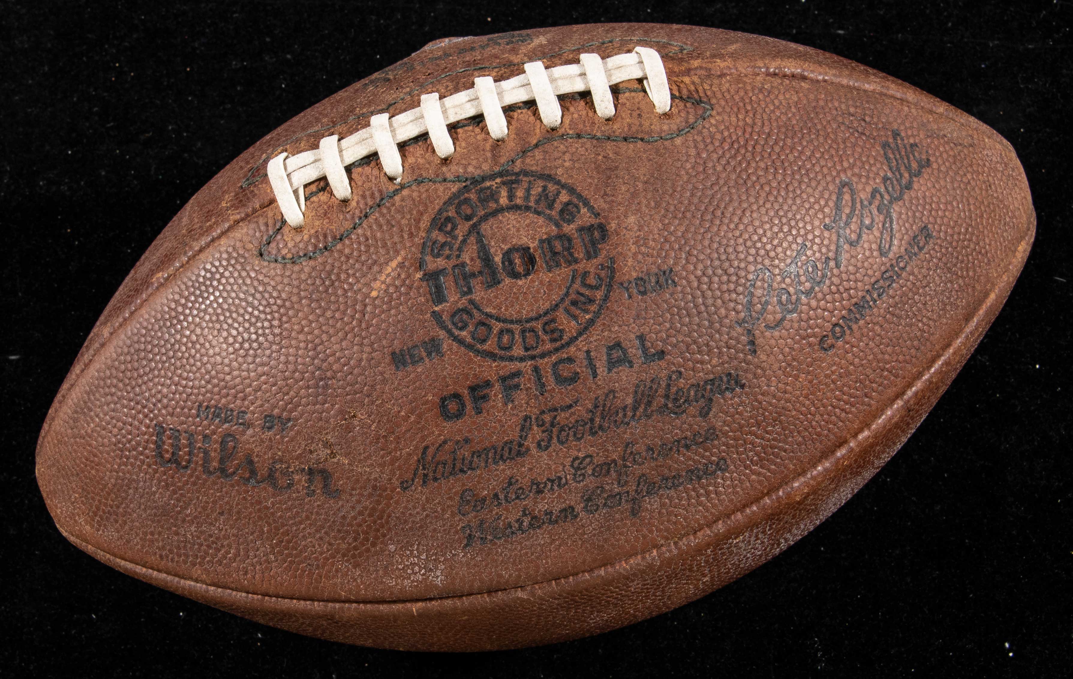 Description:Pete Rozelle NFL professional model football c.1969. NFL game football retaining "The Duke" stampings on side panel with Wilson and Thorp Sporting Goods insignia on opposite panel aside Peter Rozelle facsimile stampings. Date code "BB" denoting 1969 season use. Moderate surface wear with replaced lacings and interior bladder. Minor touch up to a few stampings: VG