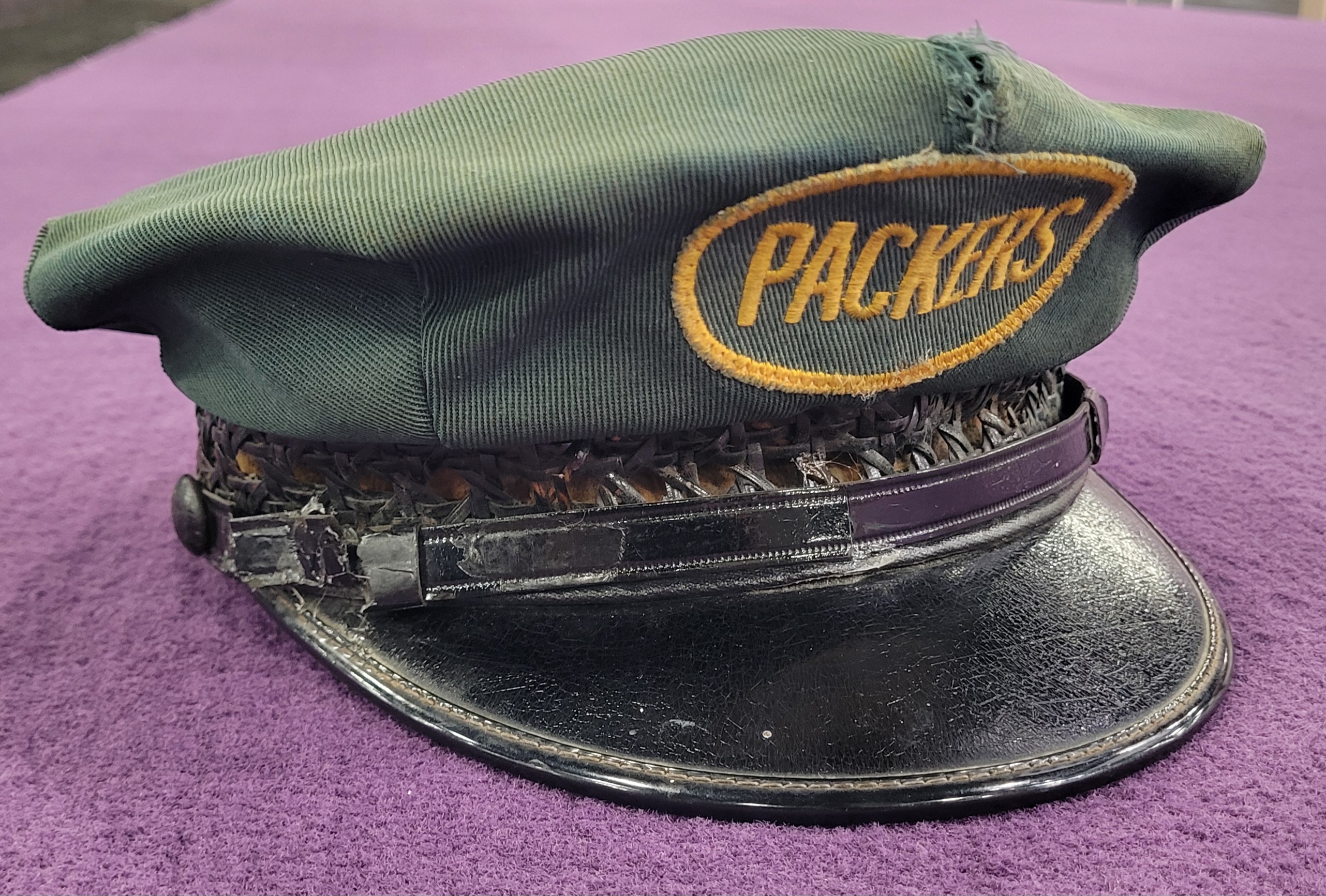 Description:Rare Green Bay Packers vintage Lambeau Field usher's hat c.1960s. Rarely seen usher's hat with "PACKERS" patch on front, and ornately designed outer band. Displays in fine condition, and remains wearable, but has a small hole above the patch, and a tear to the strap above the brim: VG/EX-EX
