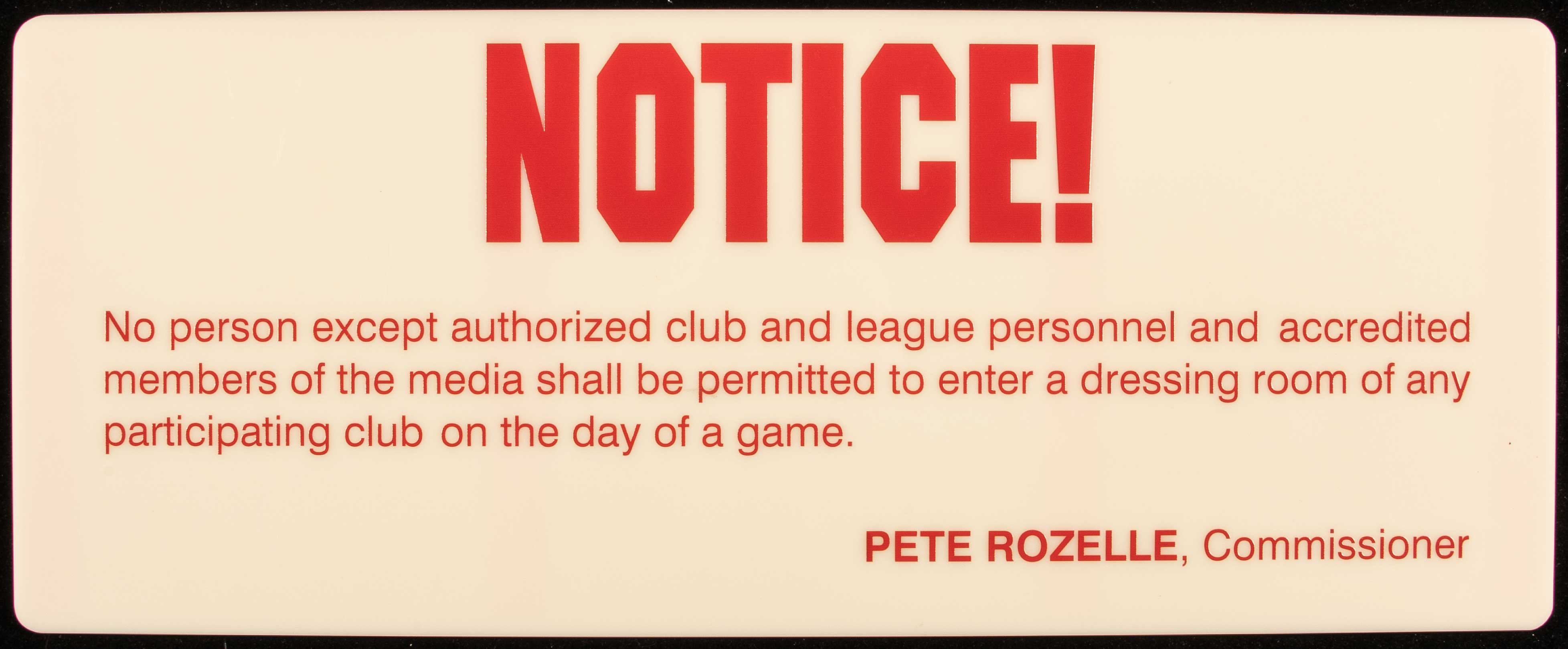 Description:NFL Locker Room display sign c.1970s. Original unused thick stock fiberglass signed regarding entry restrictions from locker rooms on game day with "Pete Rozelle, Commissioner" endorsement at bottom right. 10"x25" presenting in unused condition with 3M adhesive strips intact on the reverse: NM
