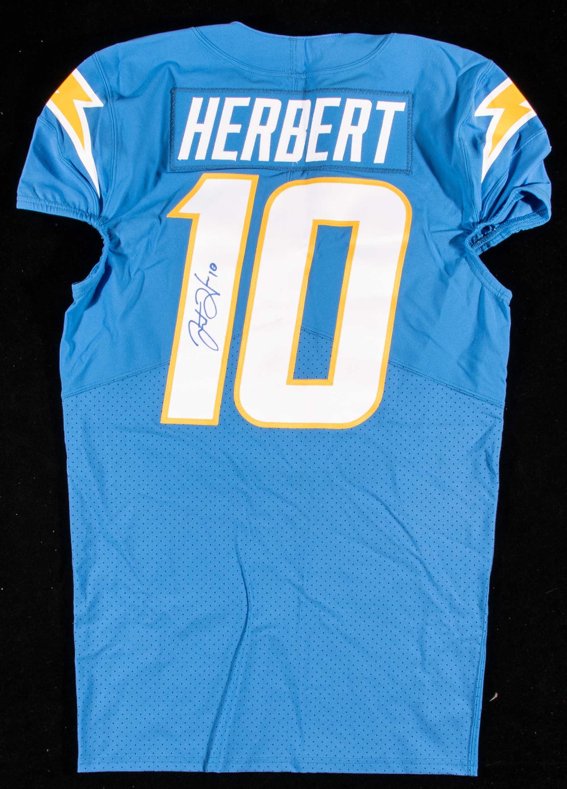 Description:Justin Herbert autographed 2021 Los Angeles Chargers professional model jersey. Nike "On Field" size 40 Chargers #10 Justin Herbert jersey with appropriate 2021 professional tagging. Herbert signed the jersey in blue marker. Signature rates 9 out of 10. Appears unused, with no visible wear. Includes NFL Auction COA from PSA/DNA, with matching serial #ed sticker on the jersey: NM
