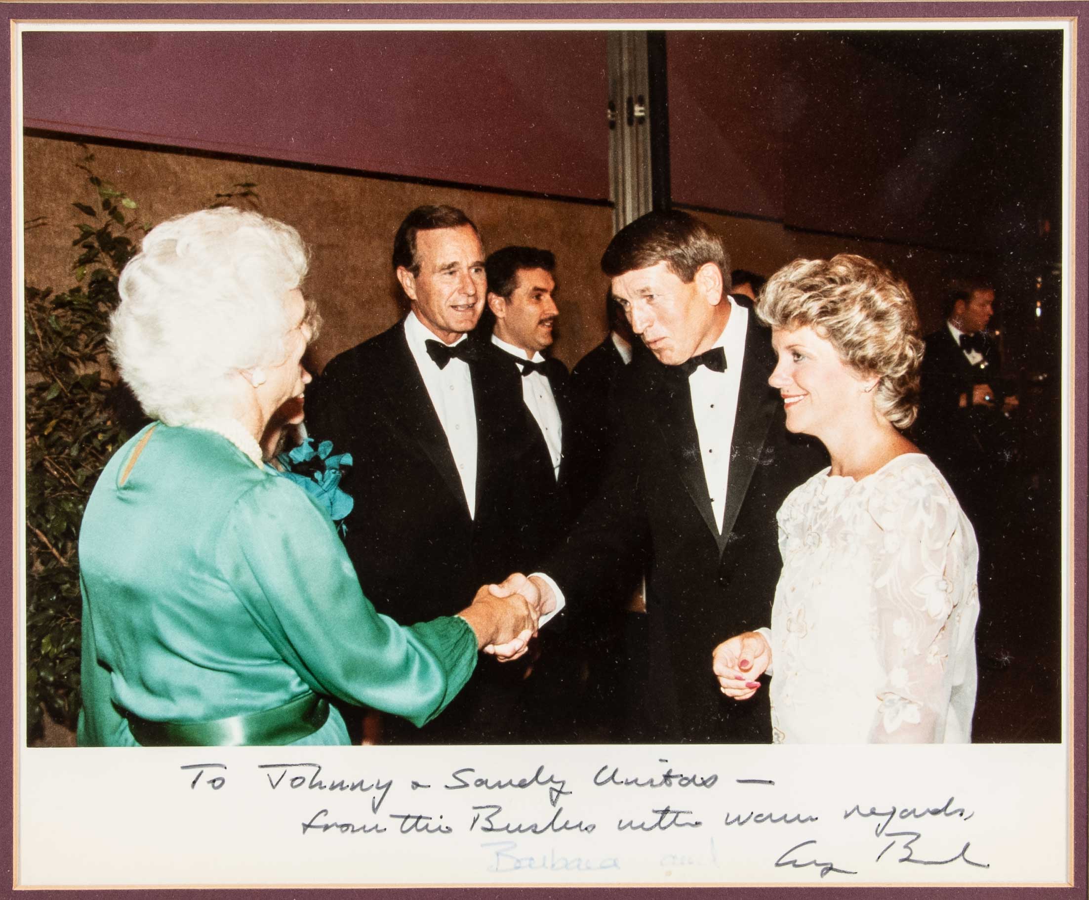 Description:George H.W. and Barbara Bush autographed photograph inscribed to Johnny Unitas. Color 8"x10" photo has been signed within the lower white border, "To Johnny + Sandy Unitas - from the Bushes with warm regards, Barbara and George Bush." The President's autograph and handwriting rate 8/9 out of 10 while that of The First Lady has faded to slightly lesser. Framed to 12.5"x14.5" with a Vice Presidential seal White House card affixed to the back (indicating that the photo was taken/signed while Bush was serving as Vice President under Ronald Reagan). Includes auction LOA from JSA and letter of provenance from the Unitas Family: EX-NM